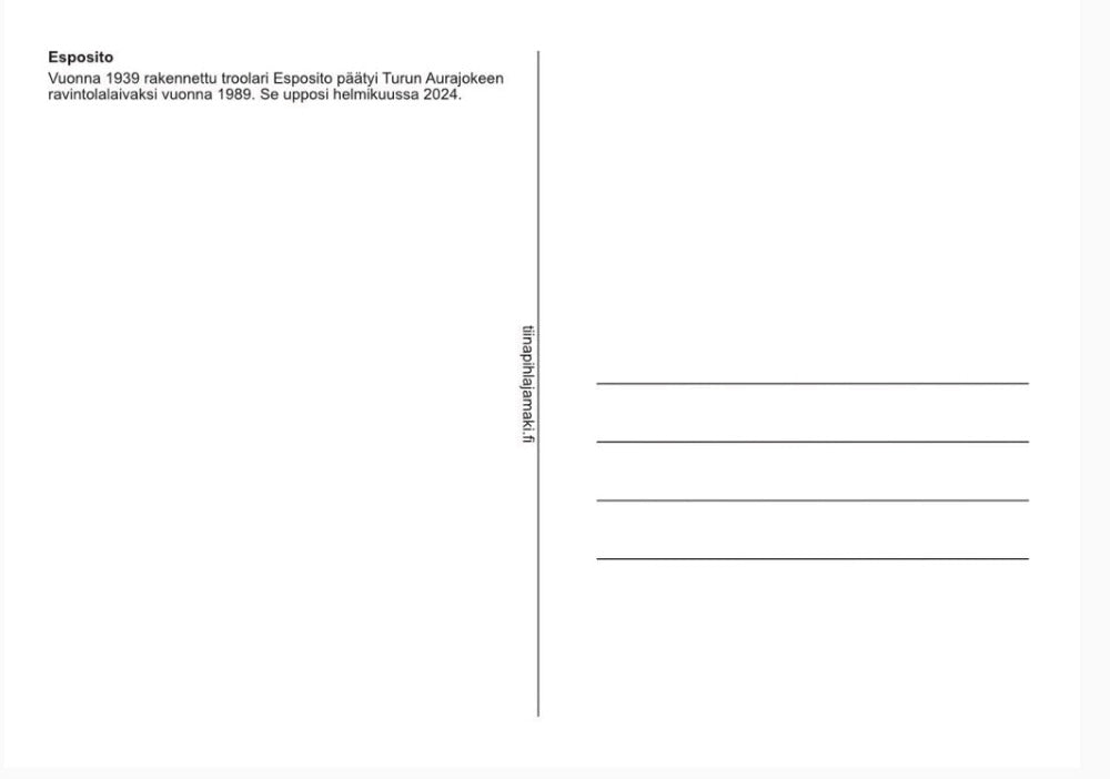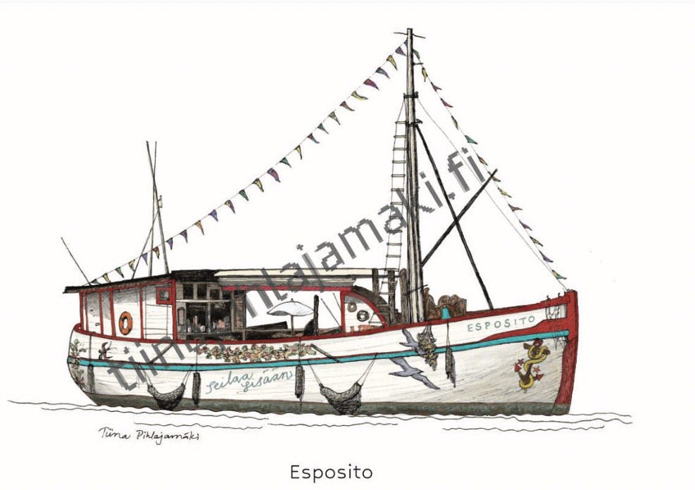 Tiina Pihlajamäki's skilful, ship-themed drawings of Turku have been printed as fine postcards, suitable for both congratulations and decoration.