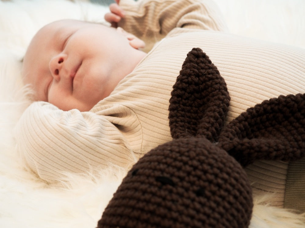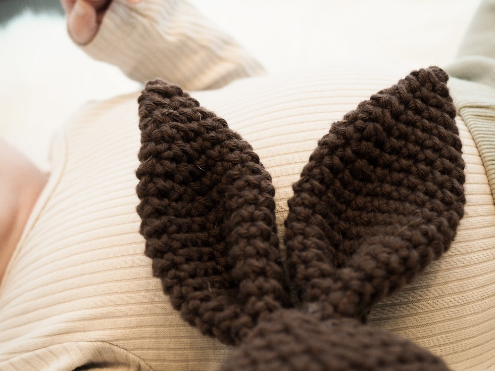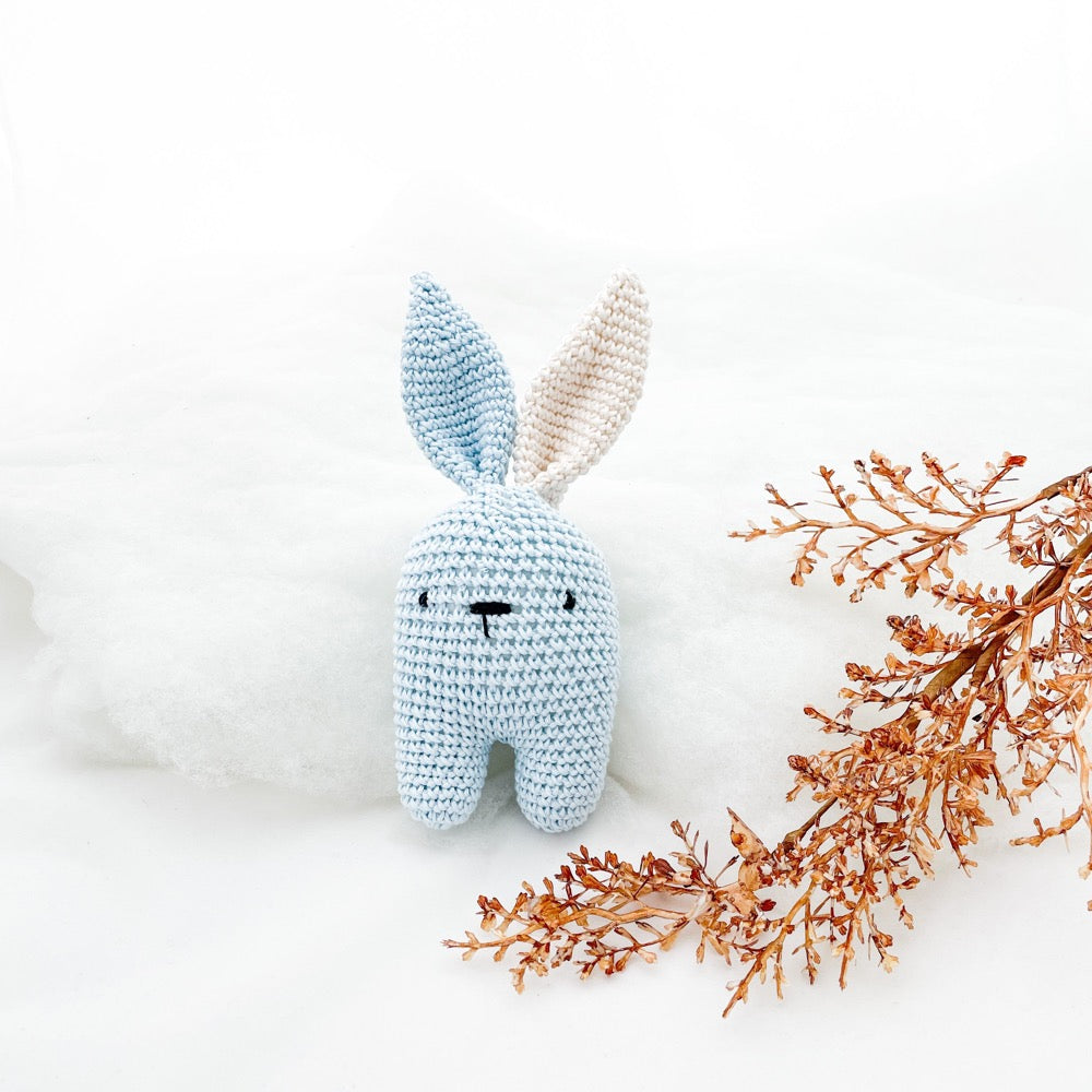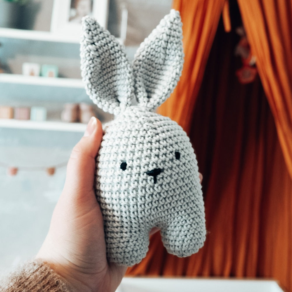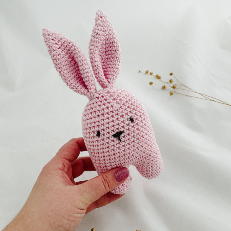 The plush bunny is a crocheted bunny made of sturdy cotton, which is about 20 cm long. Thanks to the CE mark, the bunny is also perfect for children's games. For babies, the bunnies are fun to touch , because the long ears are nice to hold on to.