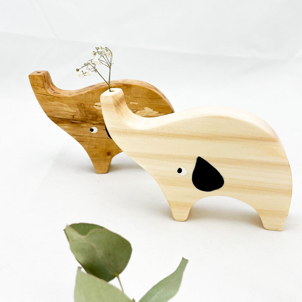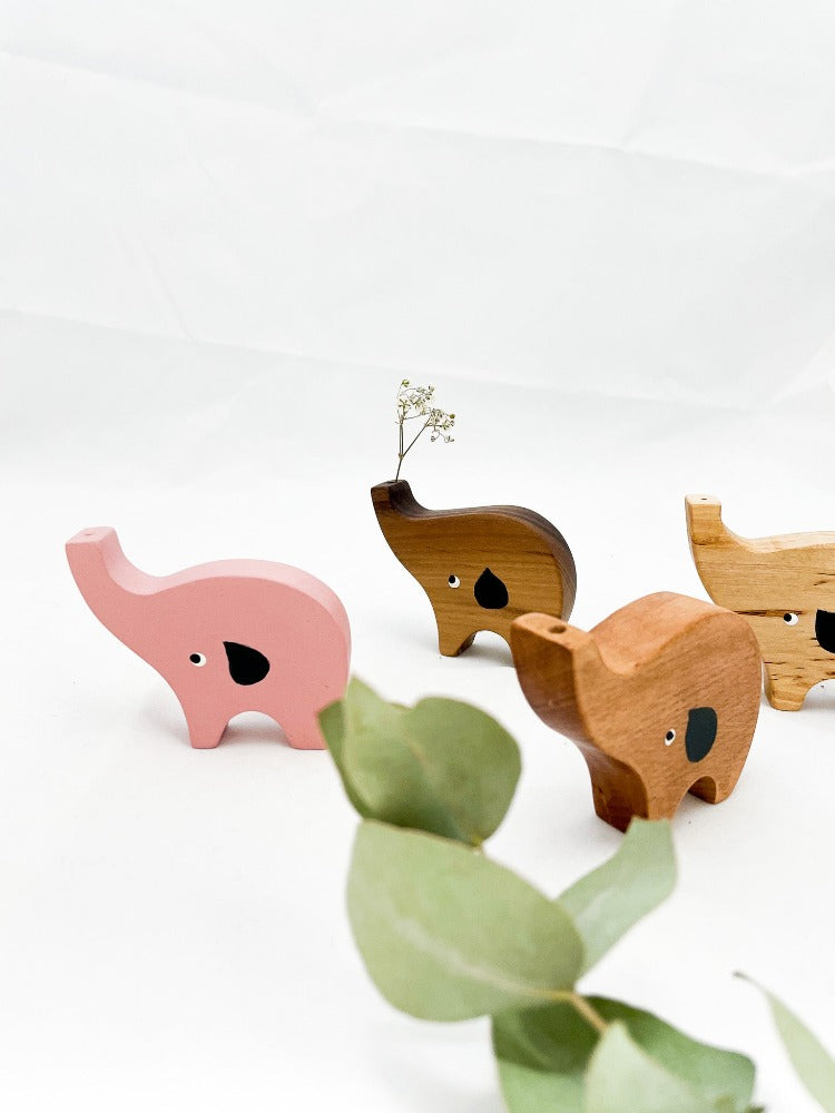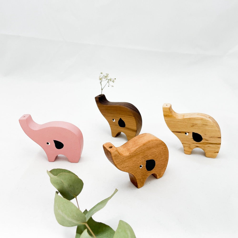 These unique elephants from Jo.ka Gallery, which also serve as flower bud vases, are handcrafted from wood. The captivating elephant vase has a small hole at the tip of its stem, where you can put a flower bud.