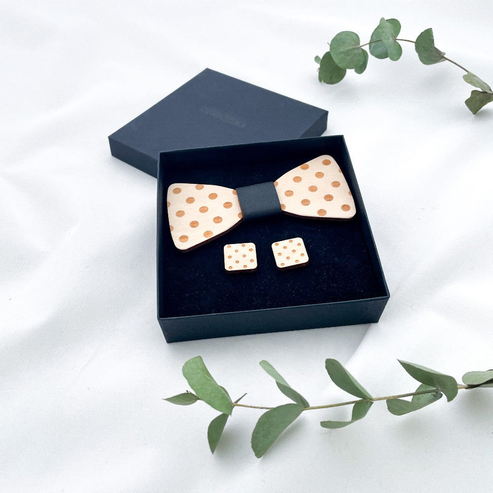 Olen loistava's made wooden bow and matching cufflinks is a combination that will surely be an eye-catcher at every party.