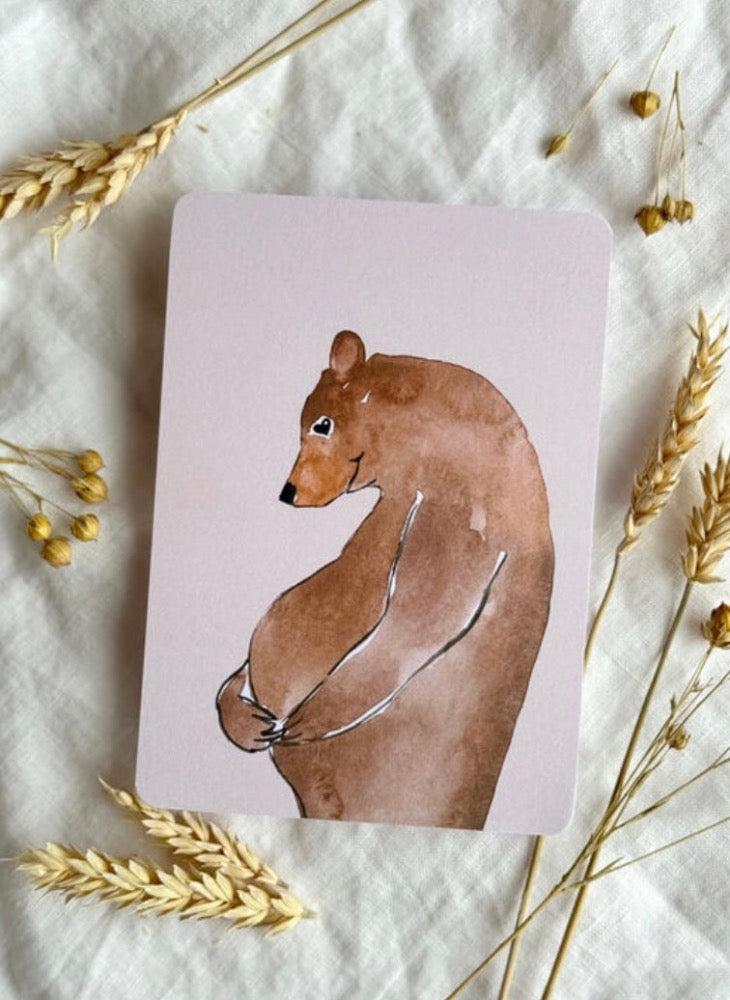 A postcard glowing with motherly love, with a picture of a lovely mamma bear. A nice gift for someone expecting a baby. The manufacturer of the pregnancy postcard is Kaverini.