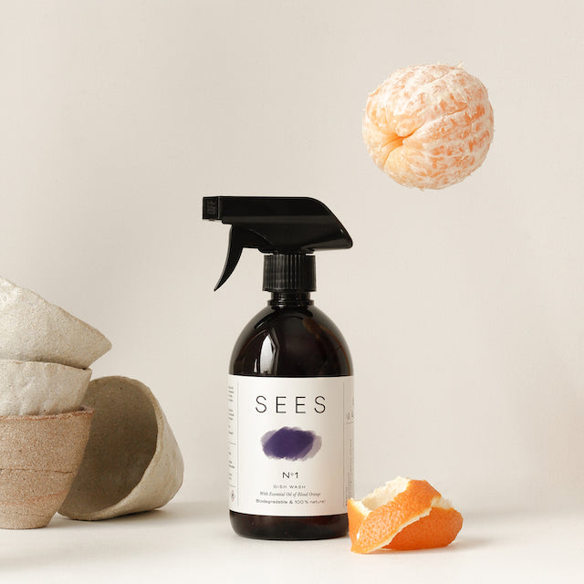 SEES No. 1 hand dishwashing liquid's fruity and fresh scent comes from genuine blood orange essential oil. Blood orange essential oil is said to calm and relax, but at the same time it also enlivens the mood. The easy-to-use and luxurious washing-up liquid is also suitable for cleaning kitchen surfaces and the dining table: wet a kitchen cloth with water and spray a small amount of washing-up liquid on it. Wipe off surfaces, the refrigerator and stubborn food and grease stains without burdening your home with unnecessary chemicals. Let essential oils cheer up your everyday life and mind.