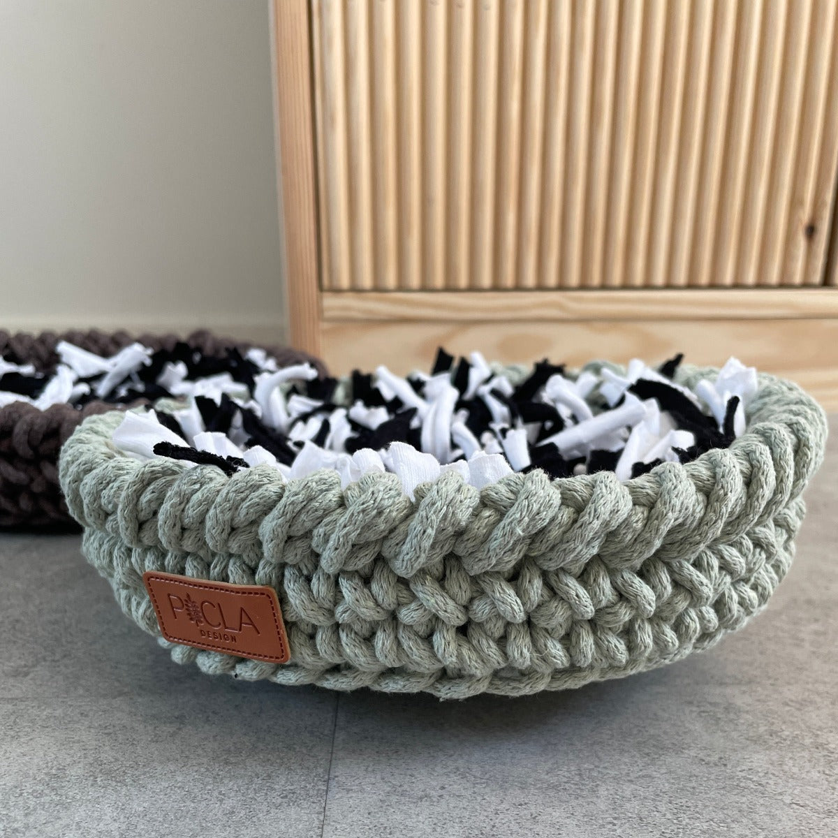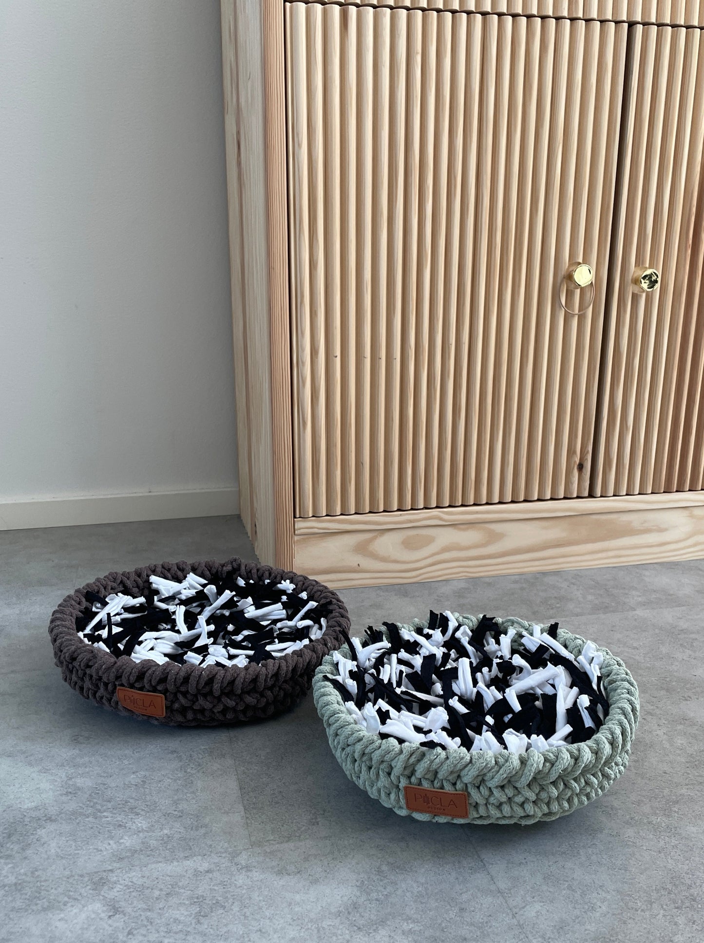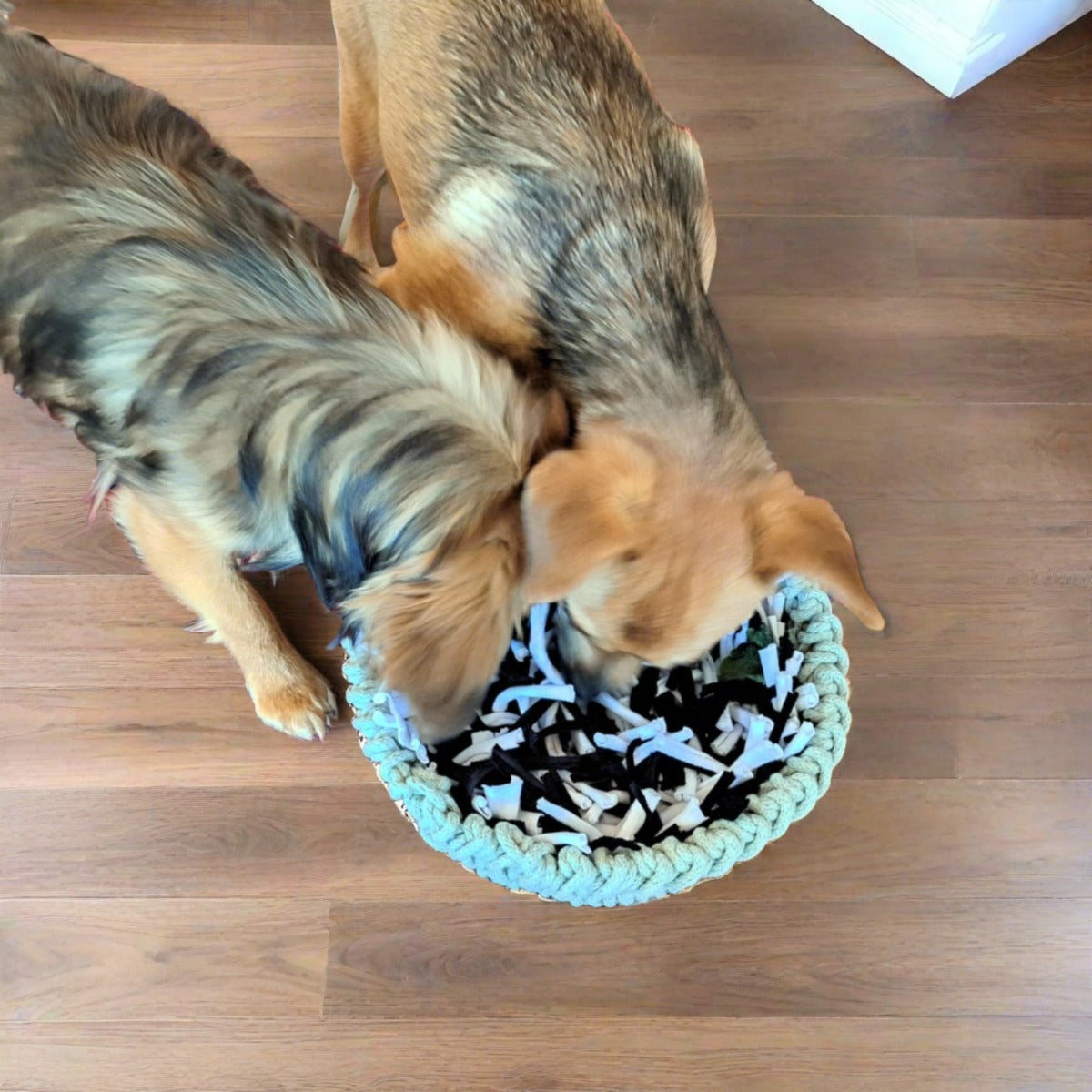 The Vainu activation toy combines the playful qualities of a dog's sniffer known from pet stores, but also the high-quality and durable handprint of Picla Design. There is no need to hide the stylish basket separately from the view of the guests. The basket-like shape of the Vainu activation toy helps the treats stay in the basket. In addition, the long fringes provide a suitable challenge when looking for treats.