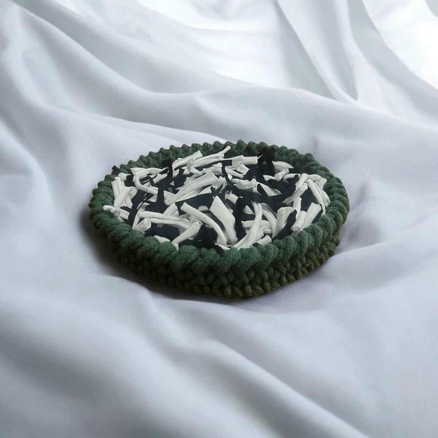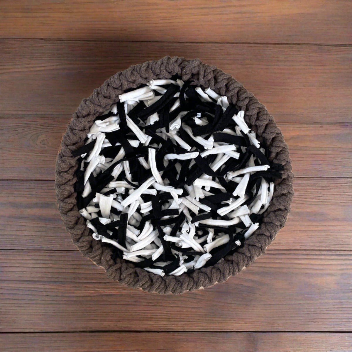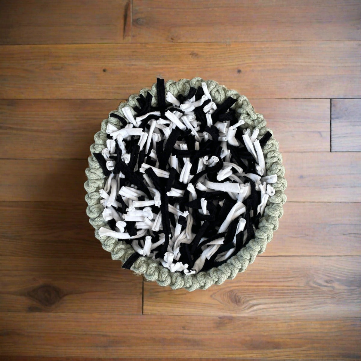 The Vainu activation toy combines the playful qualities of a dog's sniffer known from pet stores, but also the high-quality and durable handprint of Picla Design. There is no need to hide the stylish basket separately from the view of the guests. The basket-like shape of the Vainu activation toy helps the treats stay in the basket. In addition, the long fringes provide a suitable challenge when looking for treats.