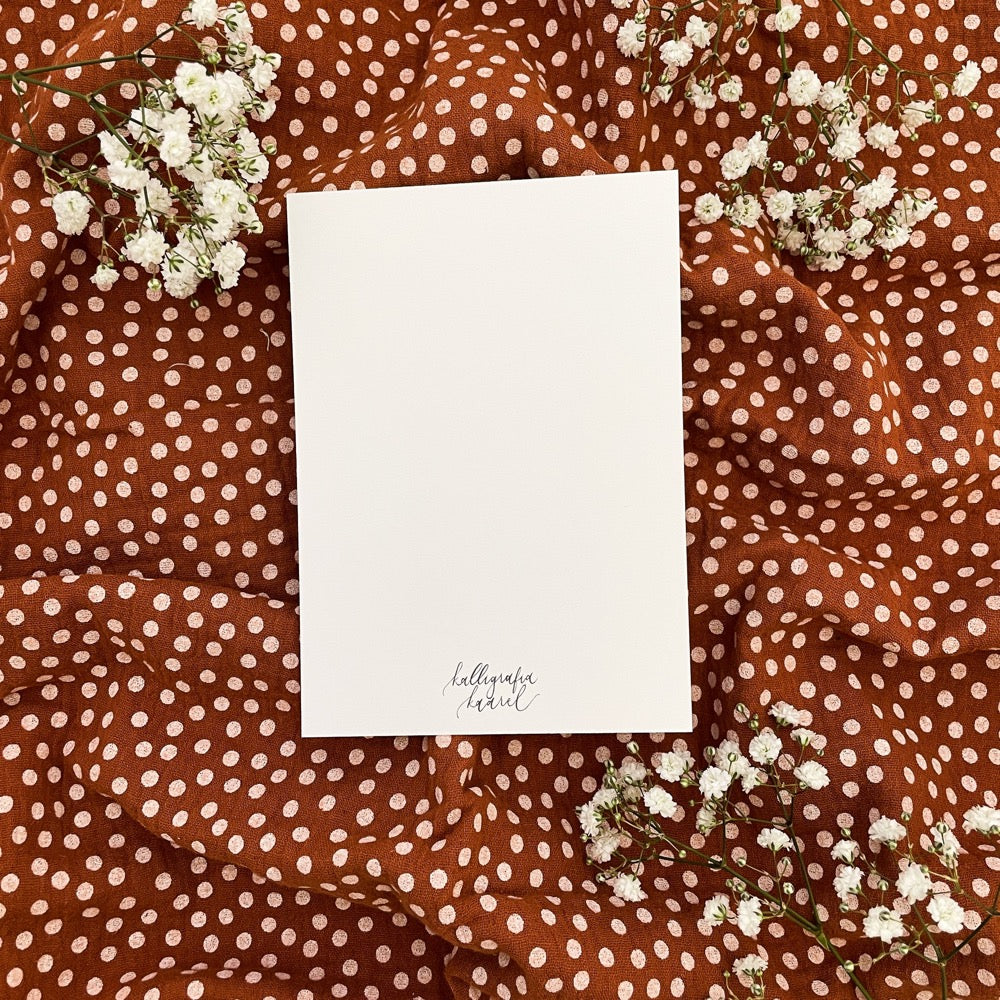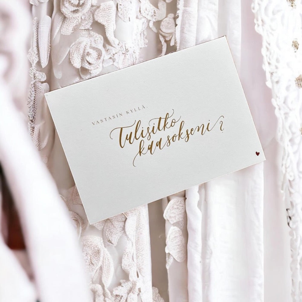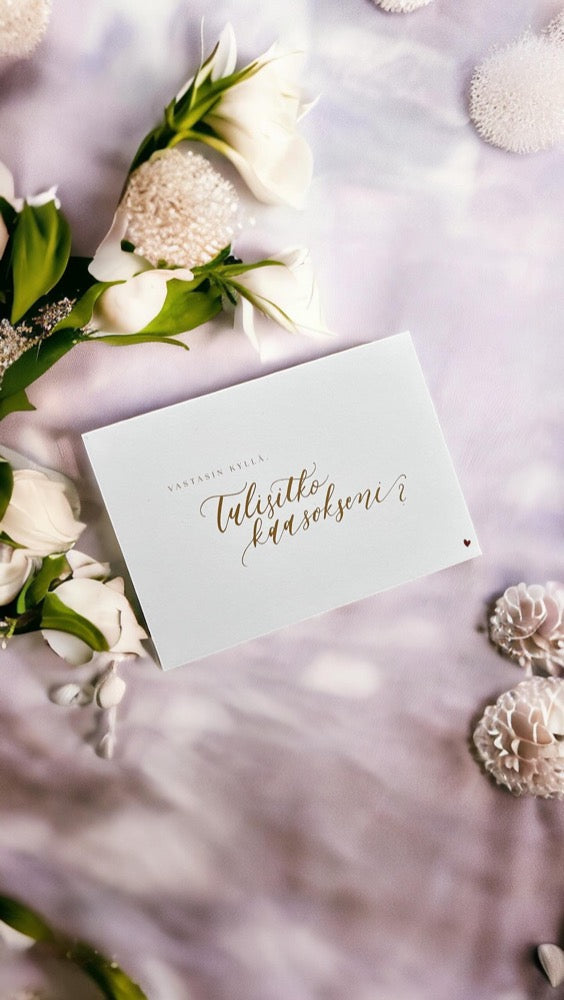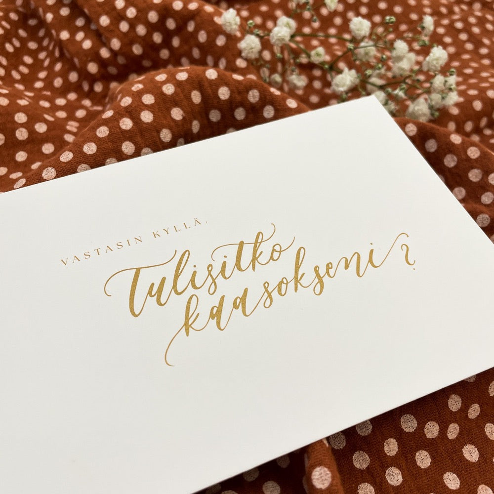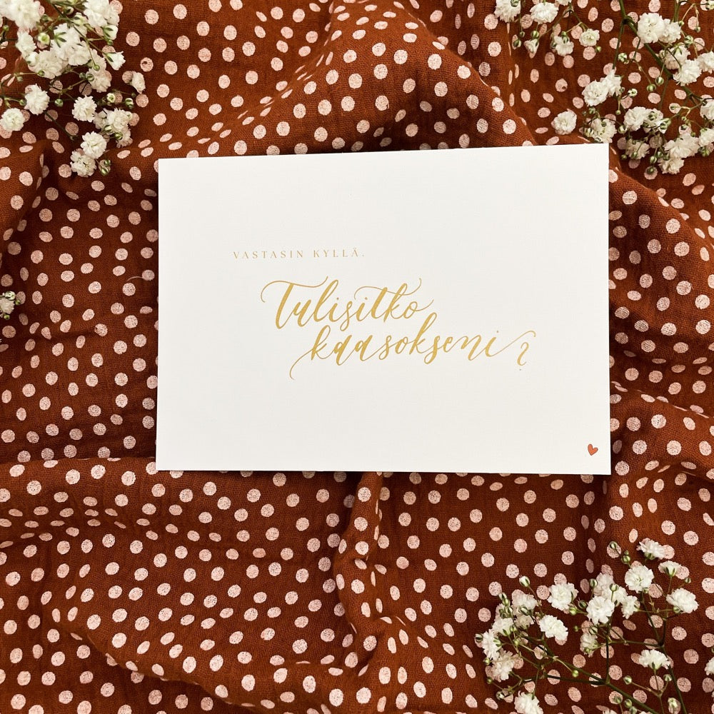 Calligraphy Kaareli's card with golden letters. The card is printed on high-quality and thick cardboard.