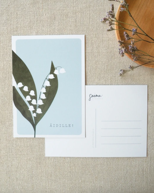 Saima Visualsin kukkateema ihastuttaa myös korttina. Kortissa on teksti ”Äidille”. Äitiä voi muistaa muutenkin, kuin äitienpäivänä!