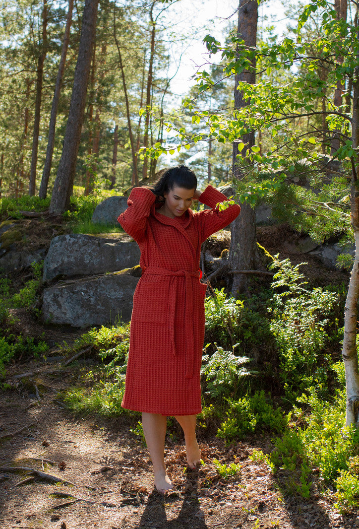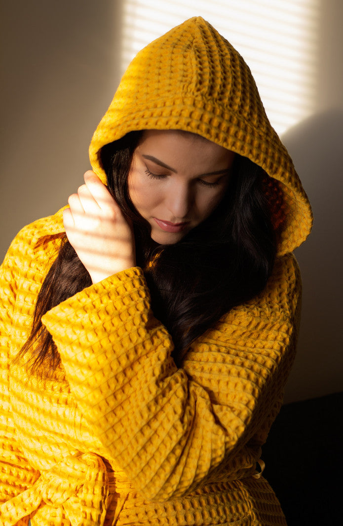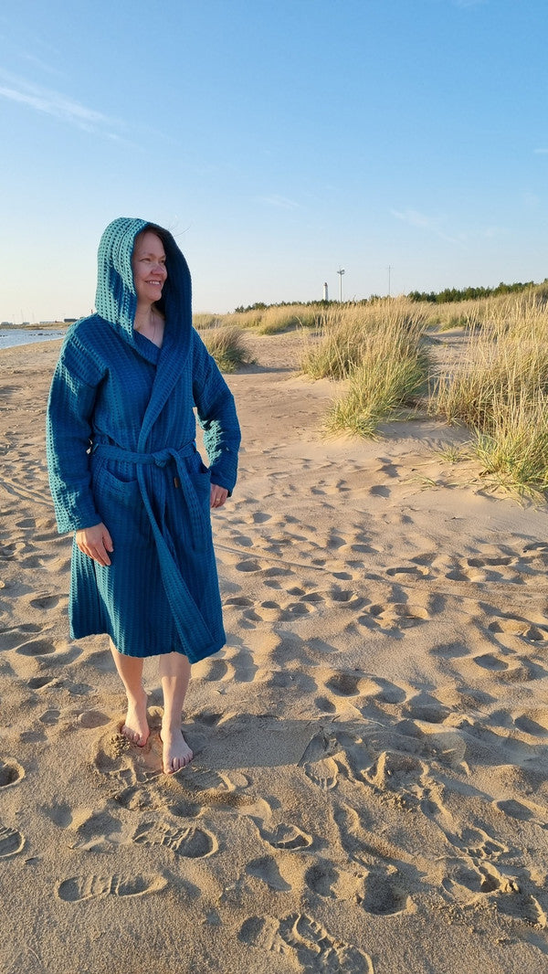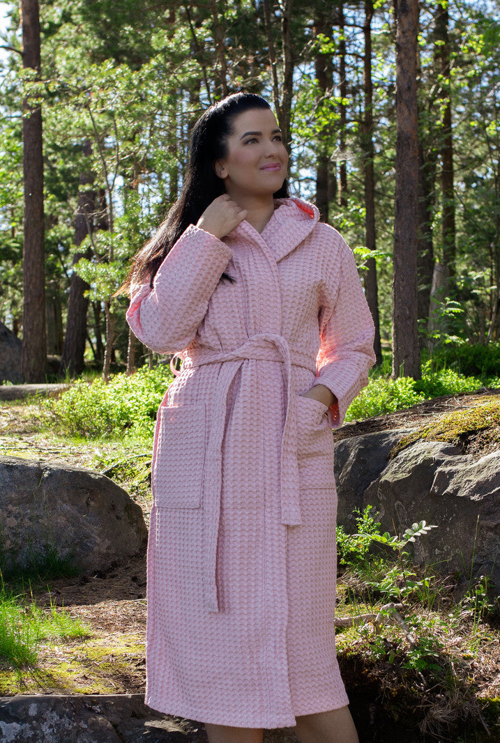 Tämä vohvelikankainen hupullinen kylpytakki sopii kaikille aikuisille, sillä saat sen juuri haluamassasi värissä ja koossa.