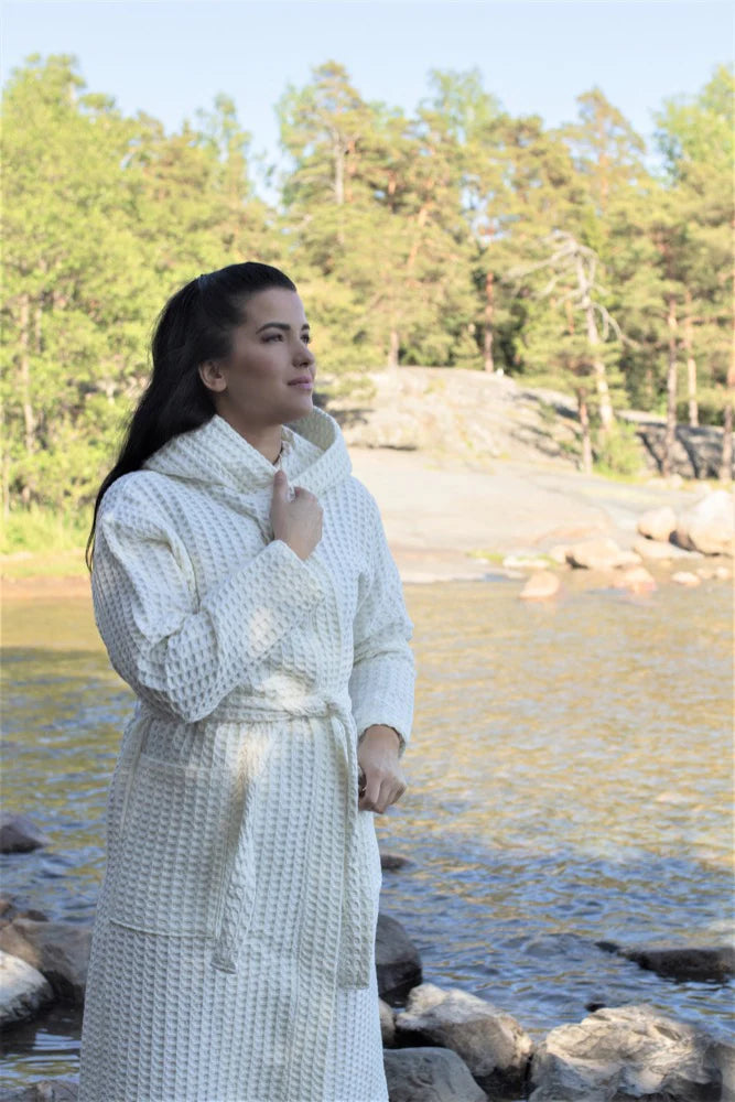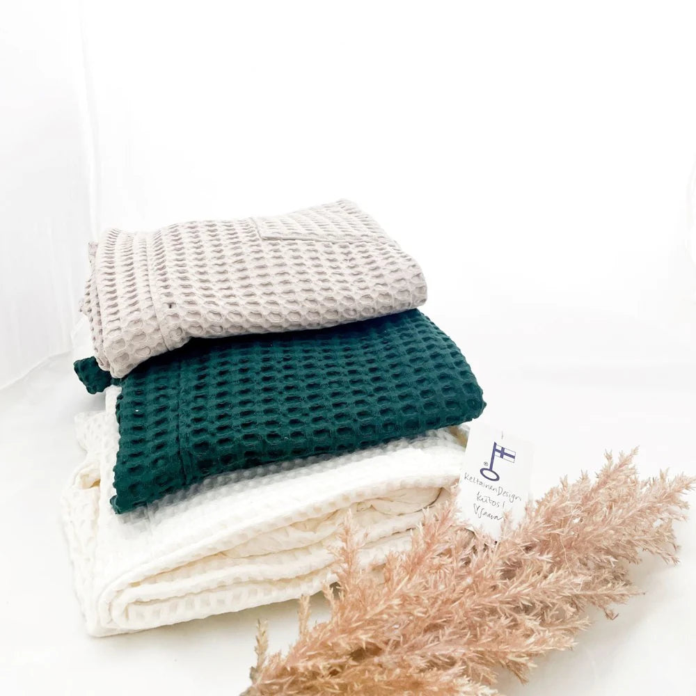 Tämä Keltainen Designin Suomessa tehty vohvelikankainen hupullinen kylpytakki sopii kaikille aikuisille, sillä saat sen juuri haluamassasi värissä ja koossa. Kylpytakin kruunaa isot taskut!