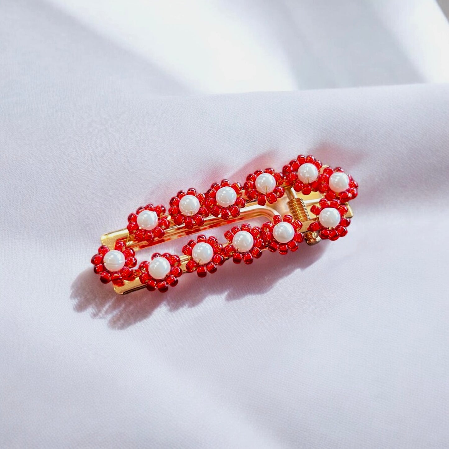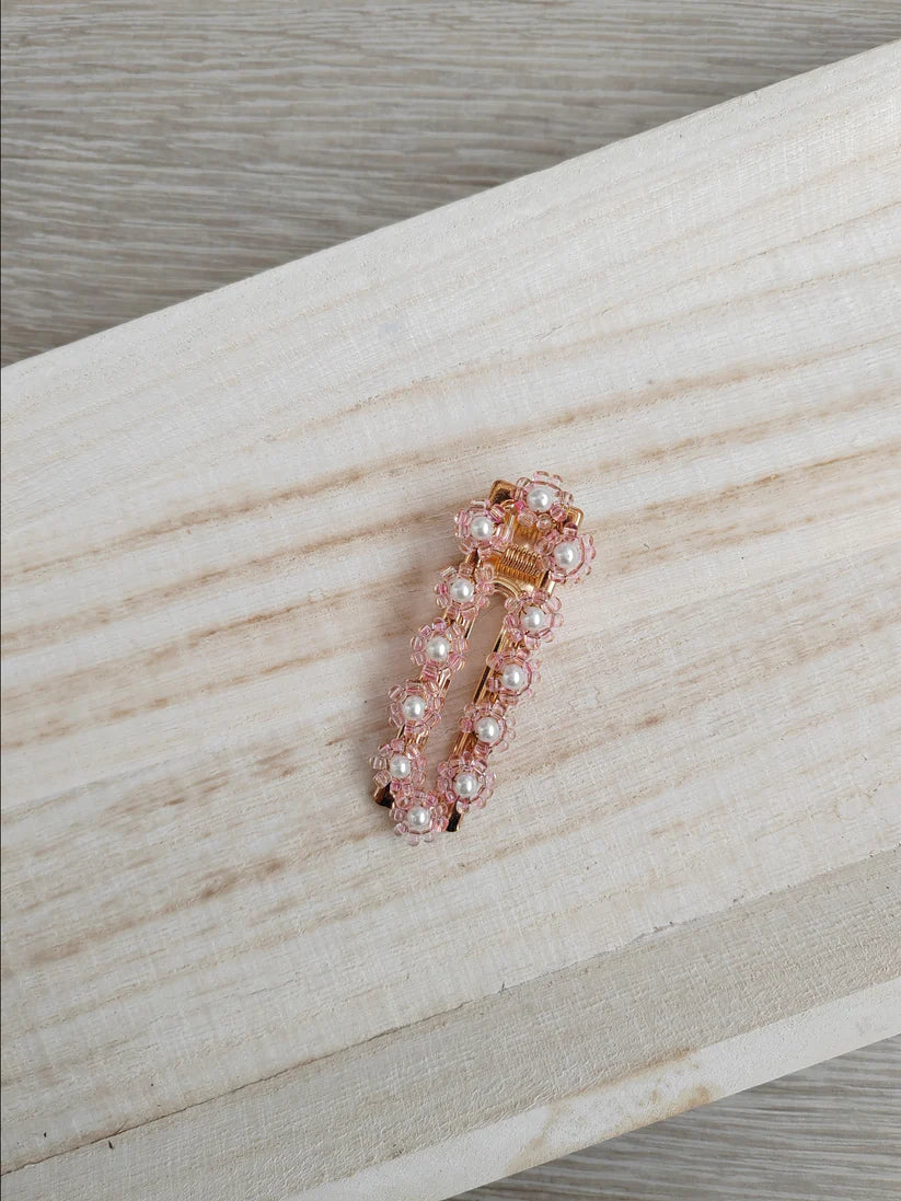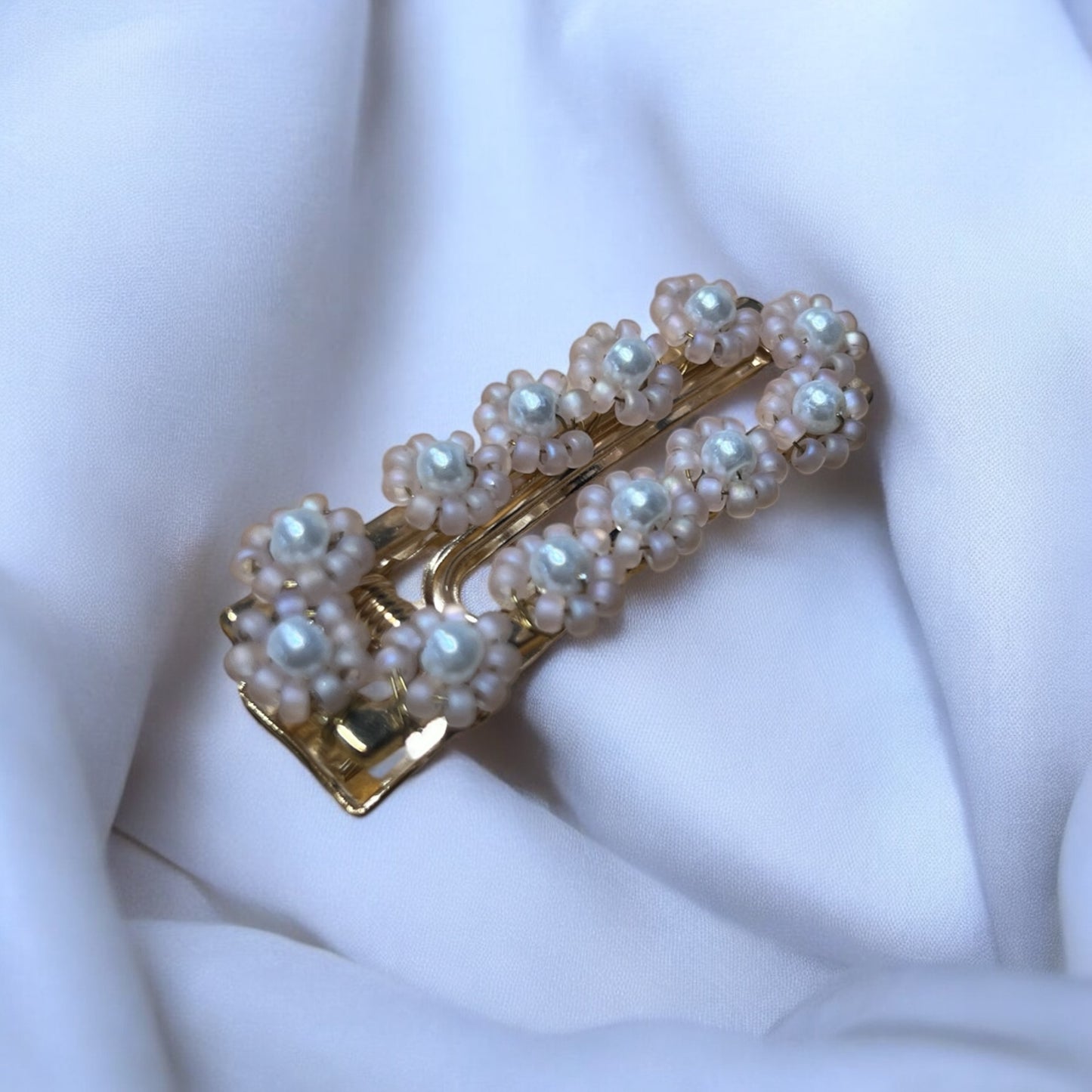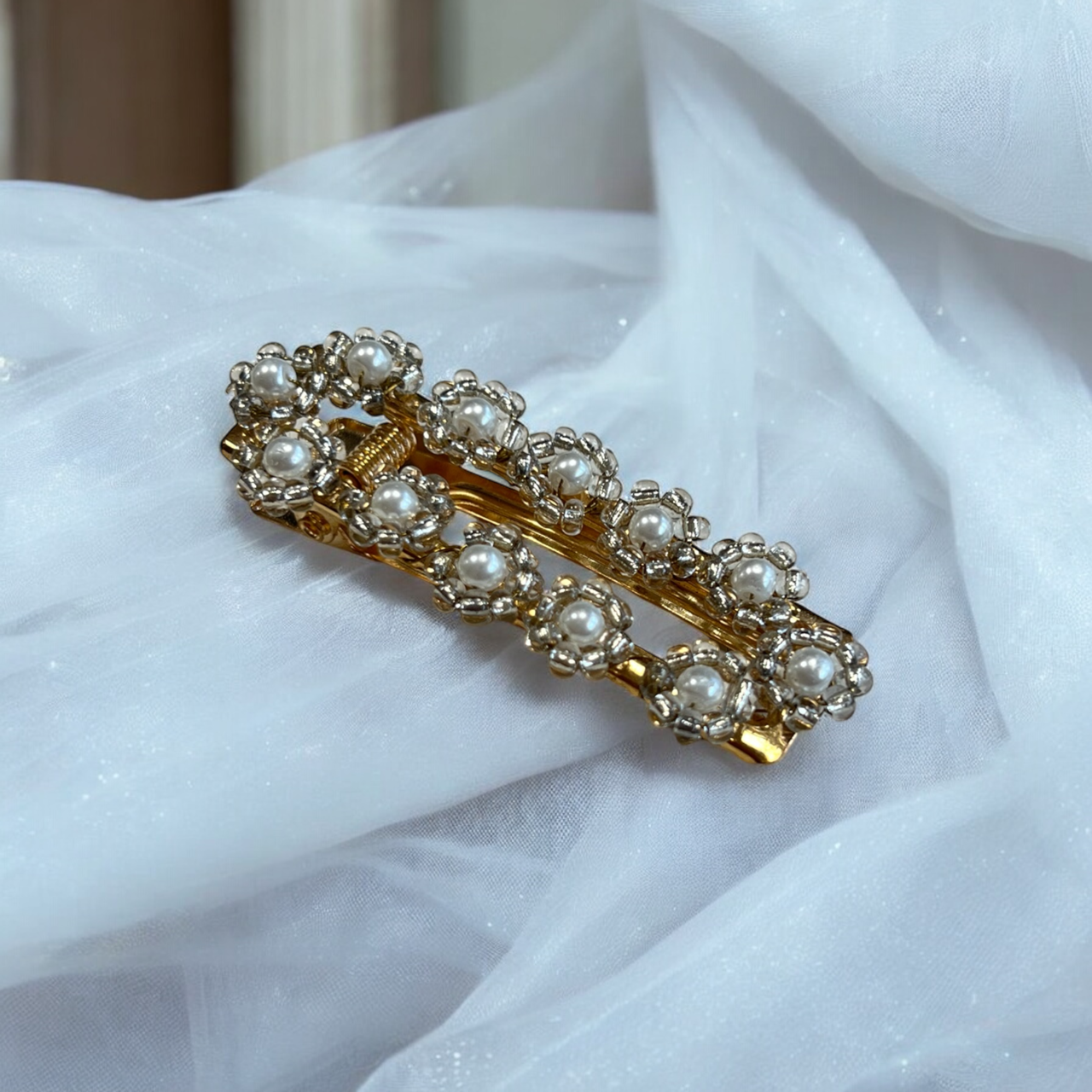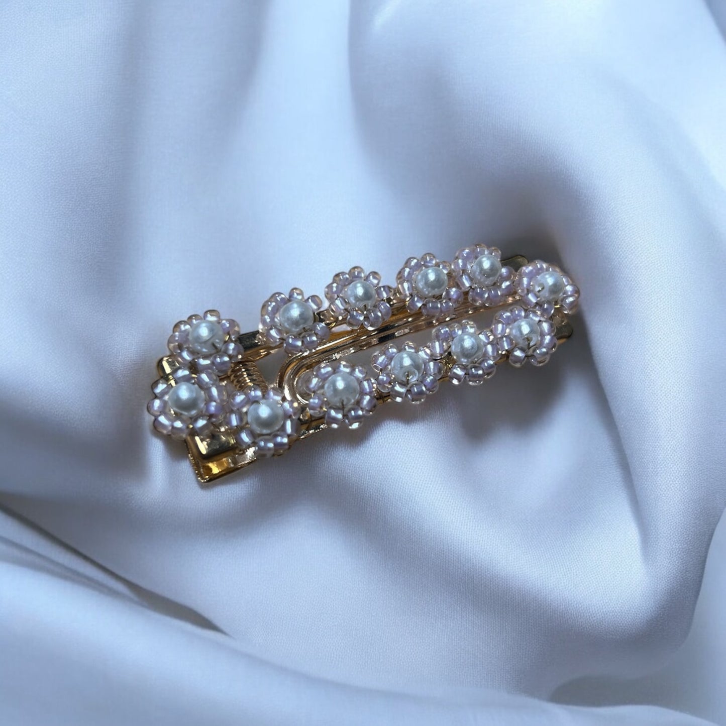 Pikku Daisyja täynnä oleva kullan värinen hiuspinni pysyy hyvin hiuksissa sahalaitaisen reunansa ansiosta. Helmet on punottu pinniin ohuella rautalangalla.