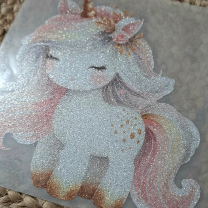 Poppaduun kimalteleva Yksisarvinen-silityskuva on helppo kiinnittää, tarvitset vain silitysraudan ja palan leivinpaperia!