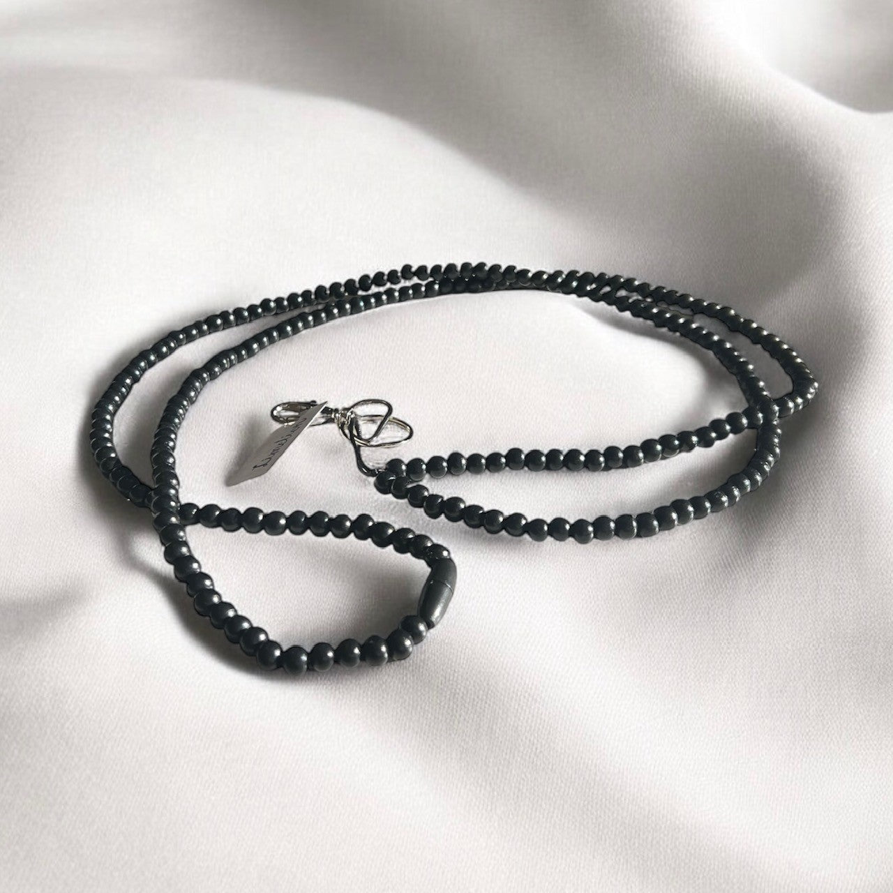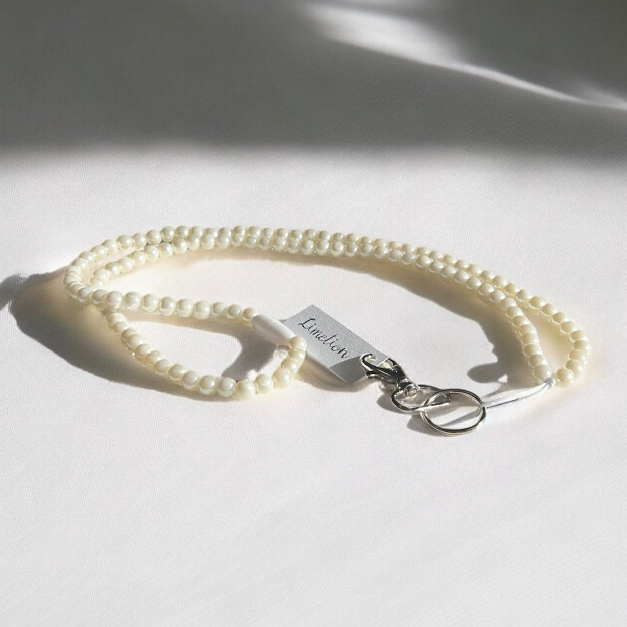 Helmet on punottu kauniiseen mustaan tai valkoiseen satiininauhaan. Nauhasta löytyy muovinen turvalukko, metallinen avainrengas ja 360 astetta pyörivä karabiinilukko.