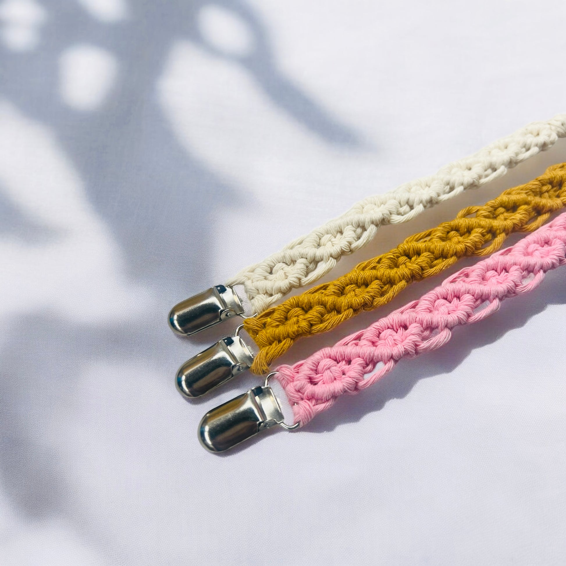 Piclan boheemit Macrame-tuttinauhat sopivat ja ovat turvallisia vauvoille ja lapsille. Tuttinauha on valmistettu kierrätyspuuvillasta. Tuttinauha on tehty käsin ja solmut tehty pitäviksi.