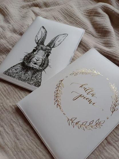 Kulta pieni -taskussa on vauvakirjan kannesta tuttu kranssi ja kulta pieni -teksti. Painatus on tehty kultafolioinnilla, ja se taittaa kauniisti valoa. Pupu-kotelo on neuvolakorttikotelo, jossa on suloinen pupupainatus.