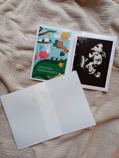 Sisällä kaksi kirkasta muovitaskua, joihin sujahtaa niin ultrakuvat kuin neuvolakorttikin. Kokonsa puolesta tässä voi säilyttää myös vaikka passia.