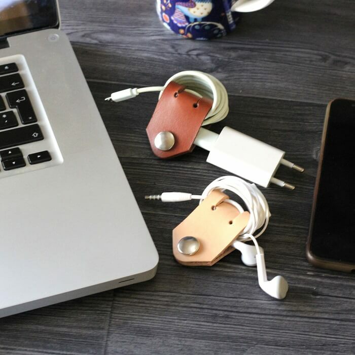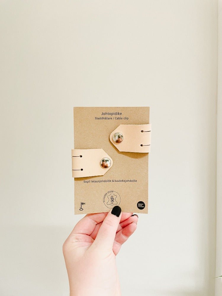 TR Leather Designin nahkasta valmistettu johtopidike. Tyylikkäällä johtopidikkeellä säilytät pidemmät johdot siististi kerällä ja saat ne taas uudelleen helposti käyttöösi. Johdot säilyvät parempana pidempään repussa tai laukussa, töissä tai kotona!