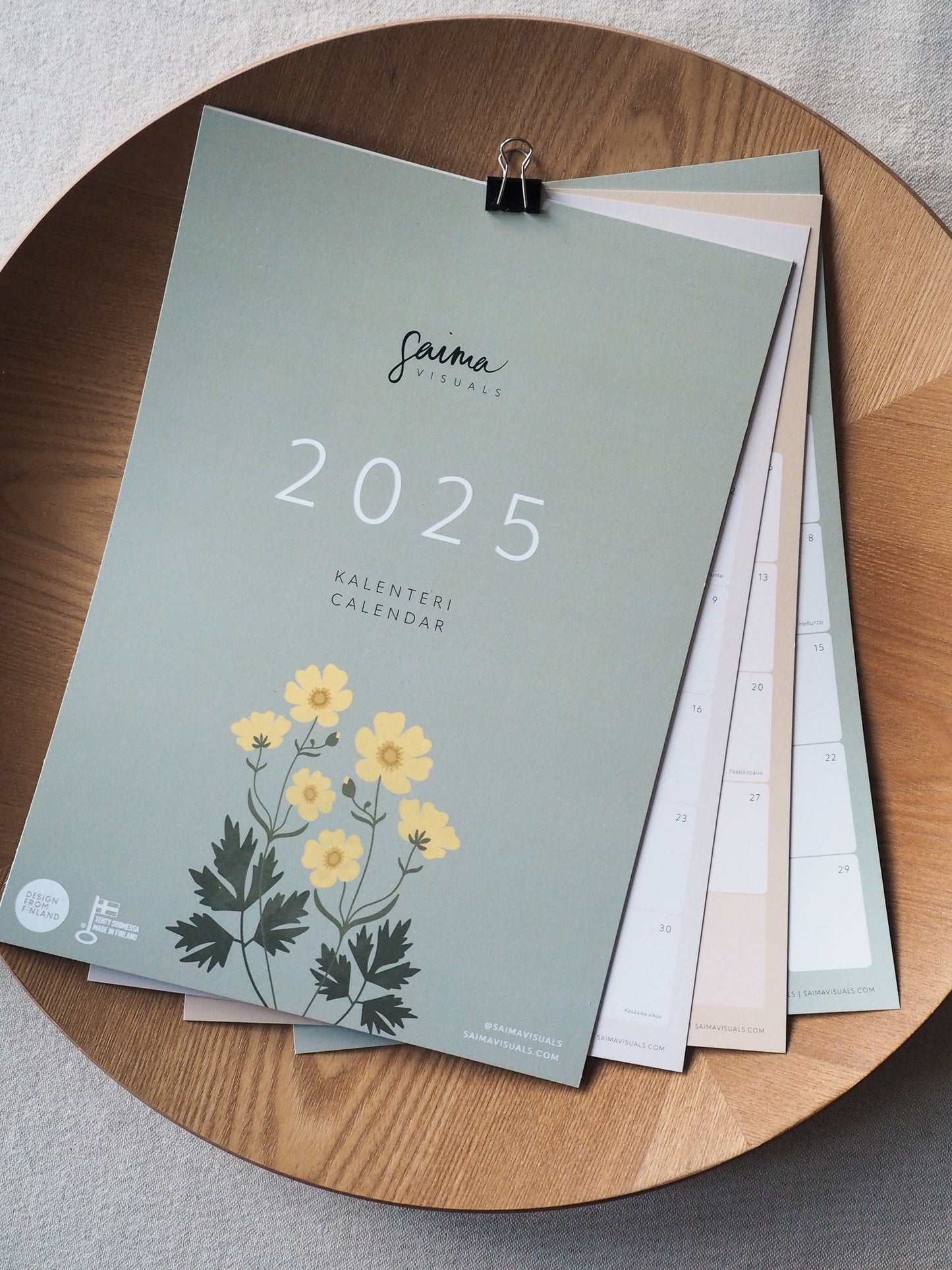 Kalenteri koostuu seitsemästä irtosivusta, jotka on painettu niin, että tammikuun toisella puolella on heinäkuu, helmikuun elokuu ja niin edelleen. Voit siis halutessasi pitää esillä useampaa peräkkäistä kuukautta. Mukana tulevan napakan klipsin avulla kalenterin voi ripustaa seinälle, mutta sivut voi kiinnittää tarpeen mukaan vaikka jääkaapin oveen.
