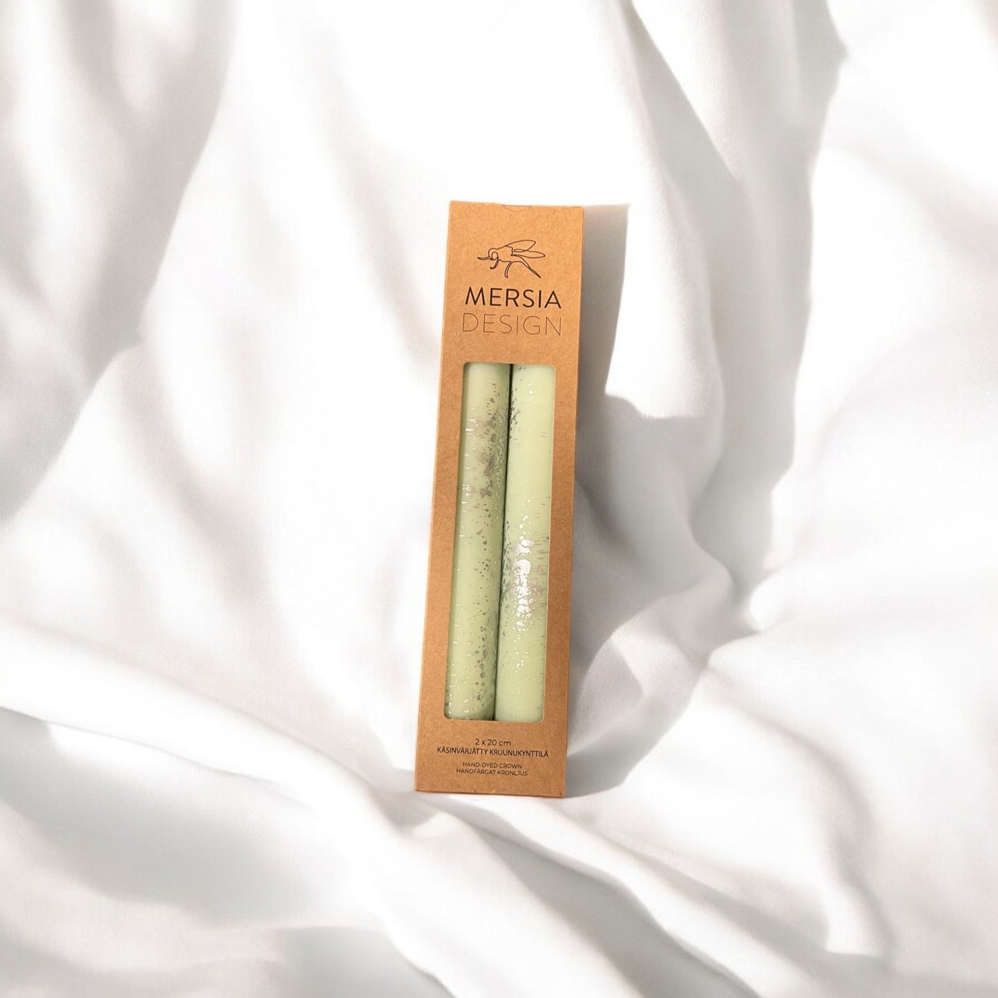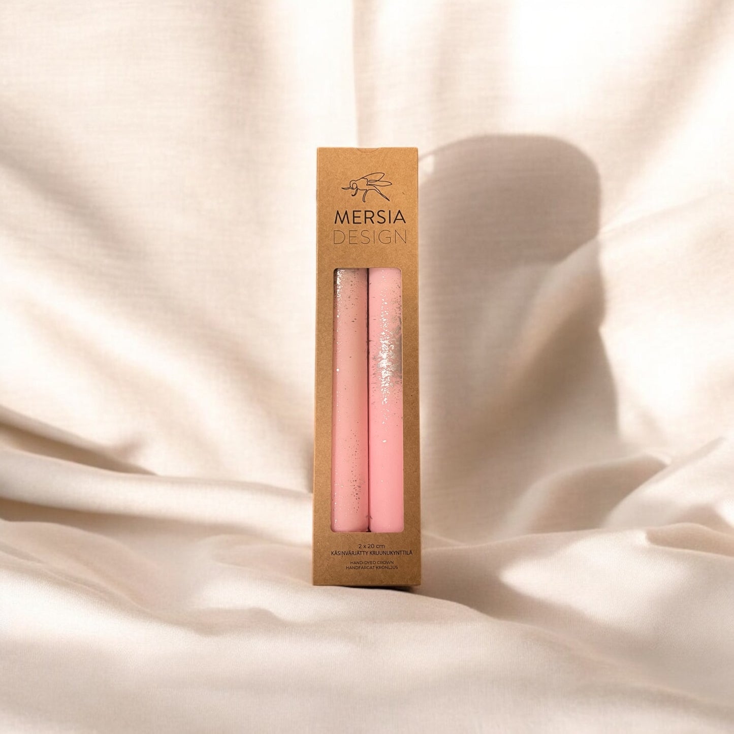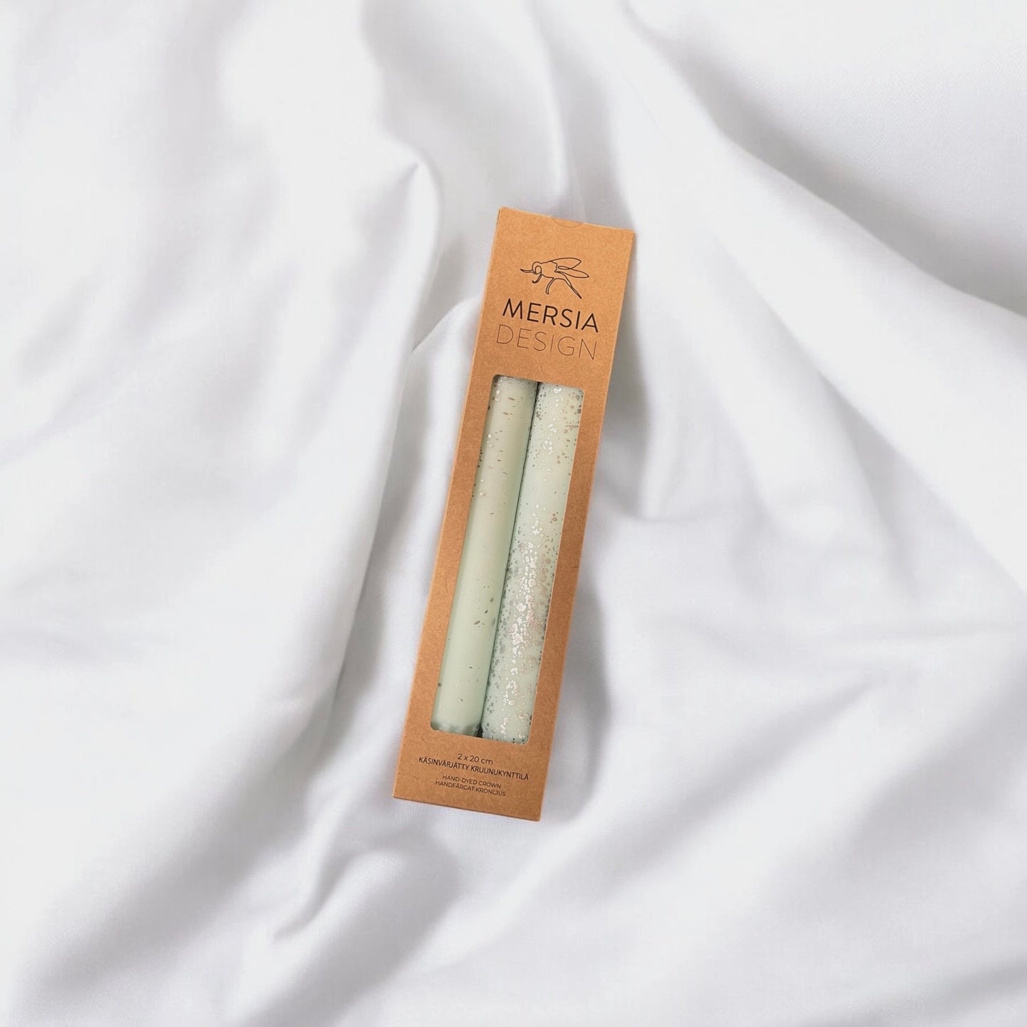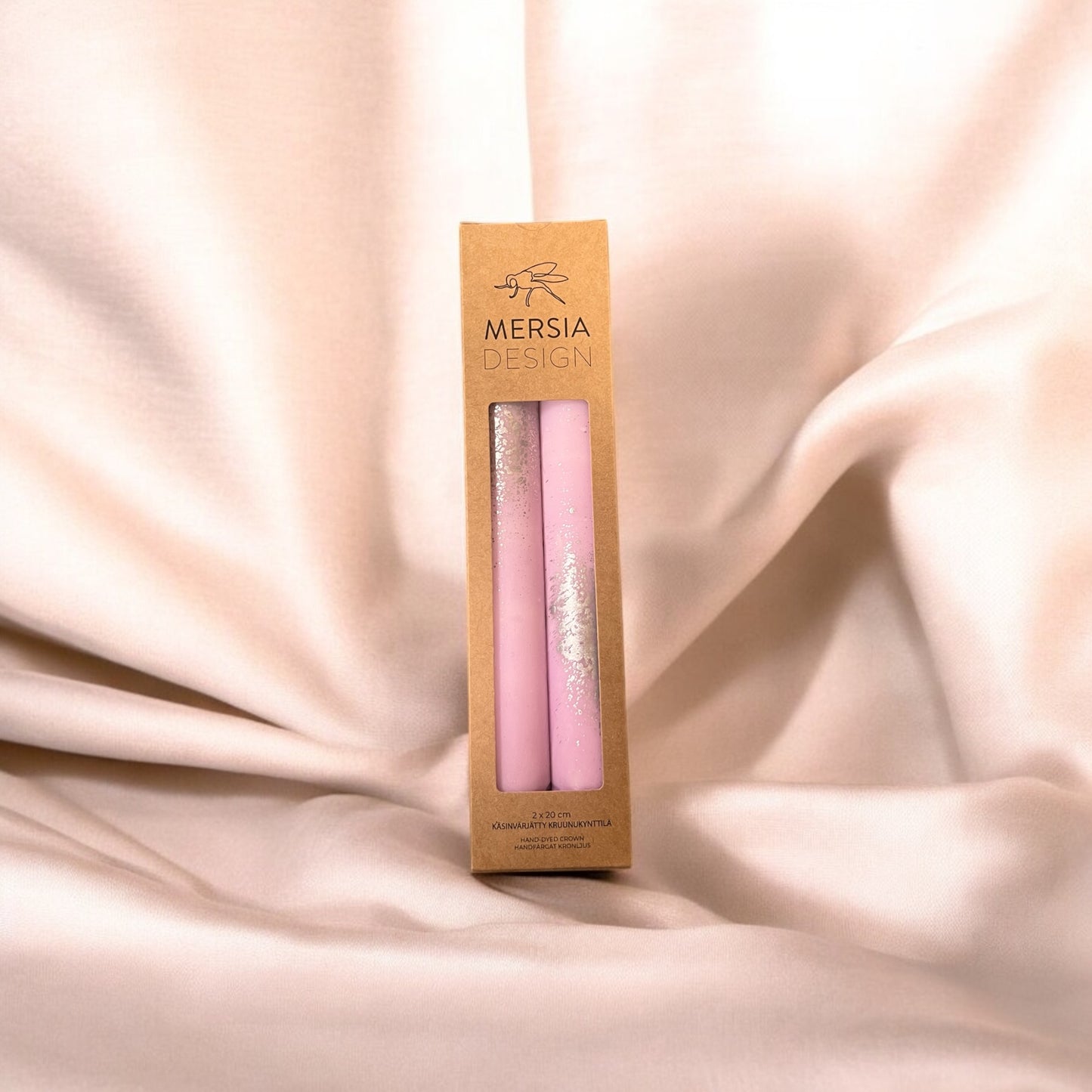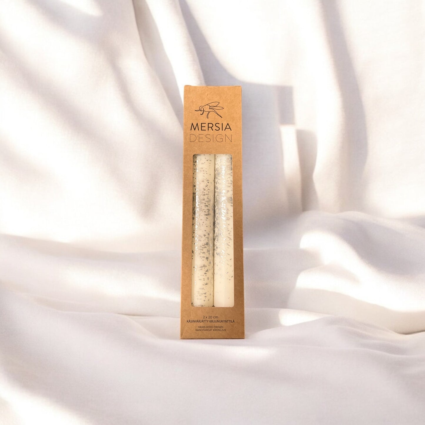 Mersia Design käsin valmistamat ja värjätyt kruunukynttilät eri väreissä hopeisilla yksityiskohdilla.