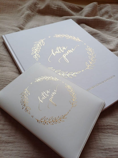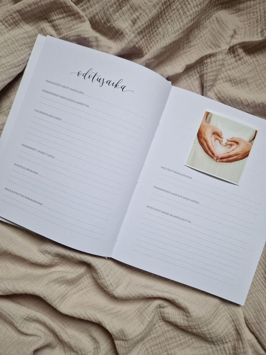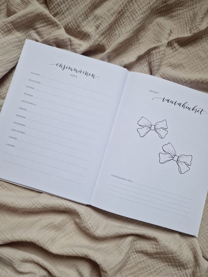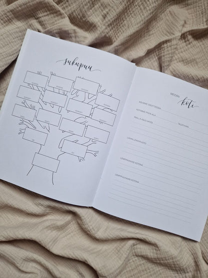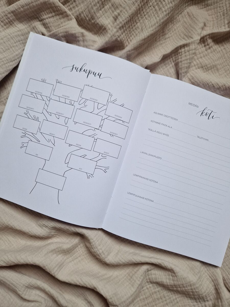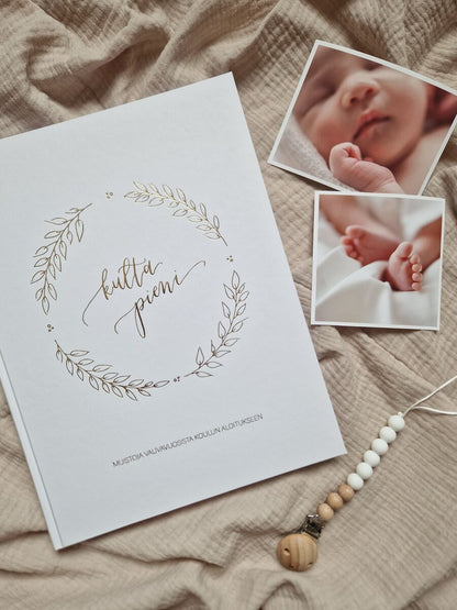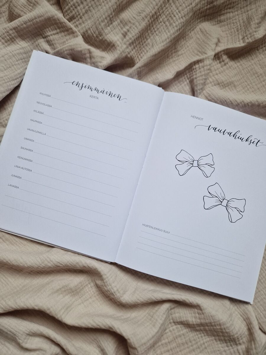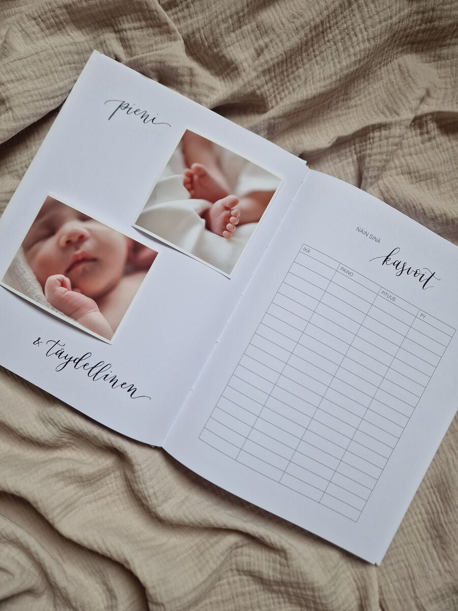 Kyseessä on laadukas ja täysin kotimainen vauvakirja, jossa on käsin kalligrafialla kirjoitetut otsikot. Kirja on suunniteltu ja valmistettu Suomessa,