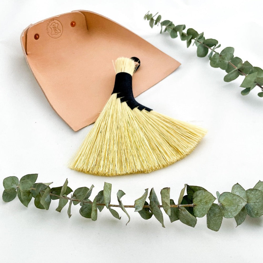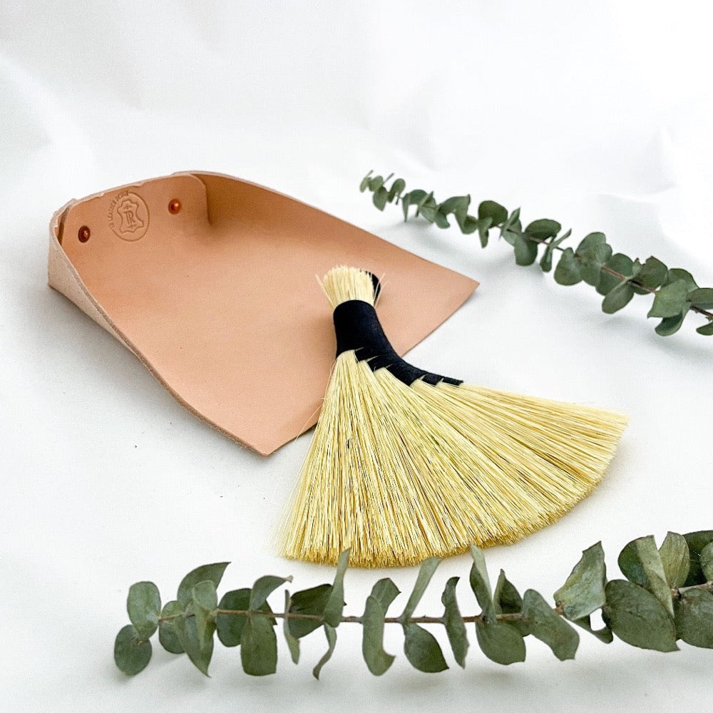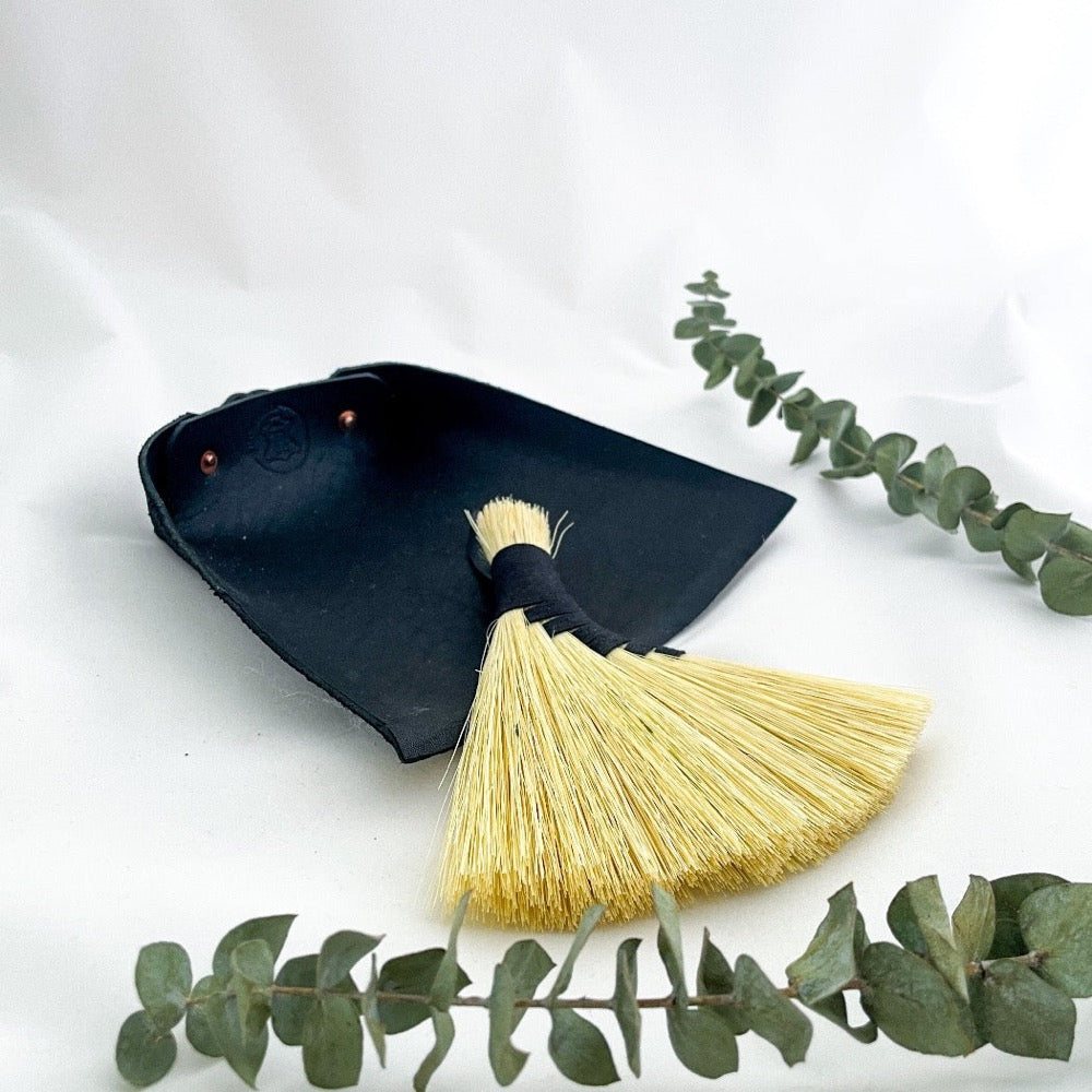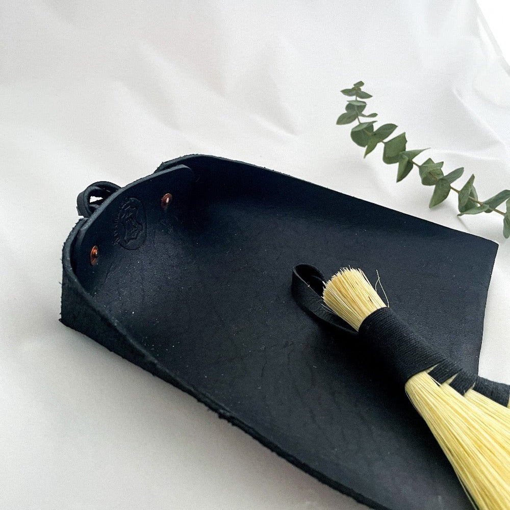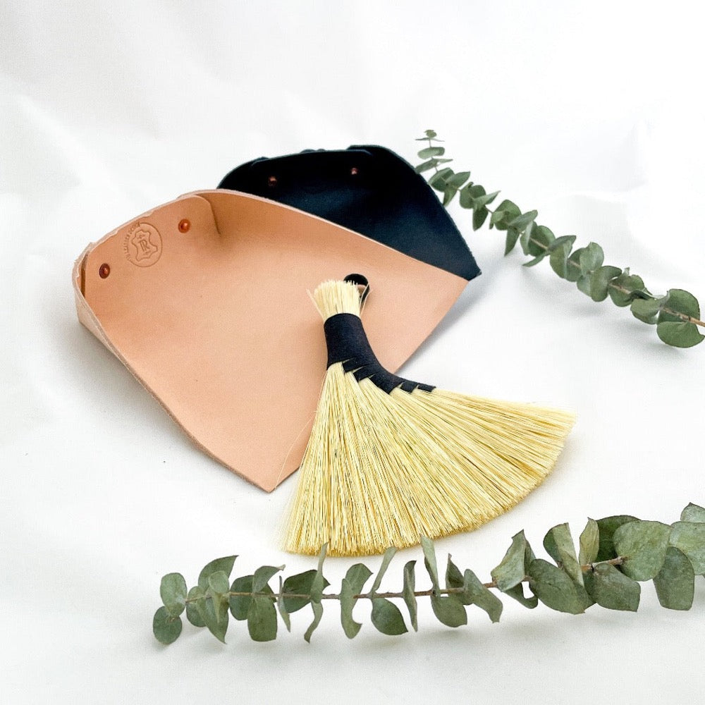TR Leather Designin nahasta valmistama Muruset rikkalapio ja harja. Luonnonharjaksisella pöytäharjalla lakaisee pöydältä murut, jauhot tai muun irtolian kätevästi. Rikkalapio on näppärän kokoinen käyttää pöydän siivoamiseen eikä se vie paljoa säilytystilaa. Tyylikästä rikkalapiosettiä kelpaa säilyttää myös esillä esimerkiksi tuvan seinällä naulassa.