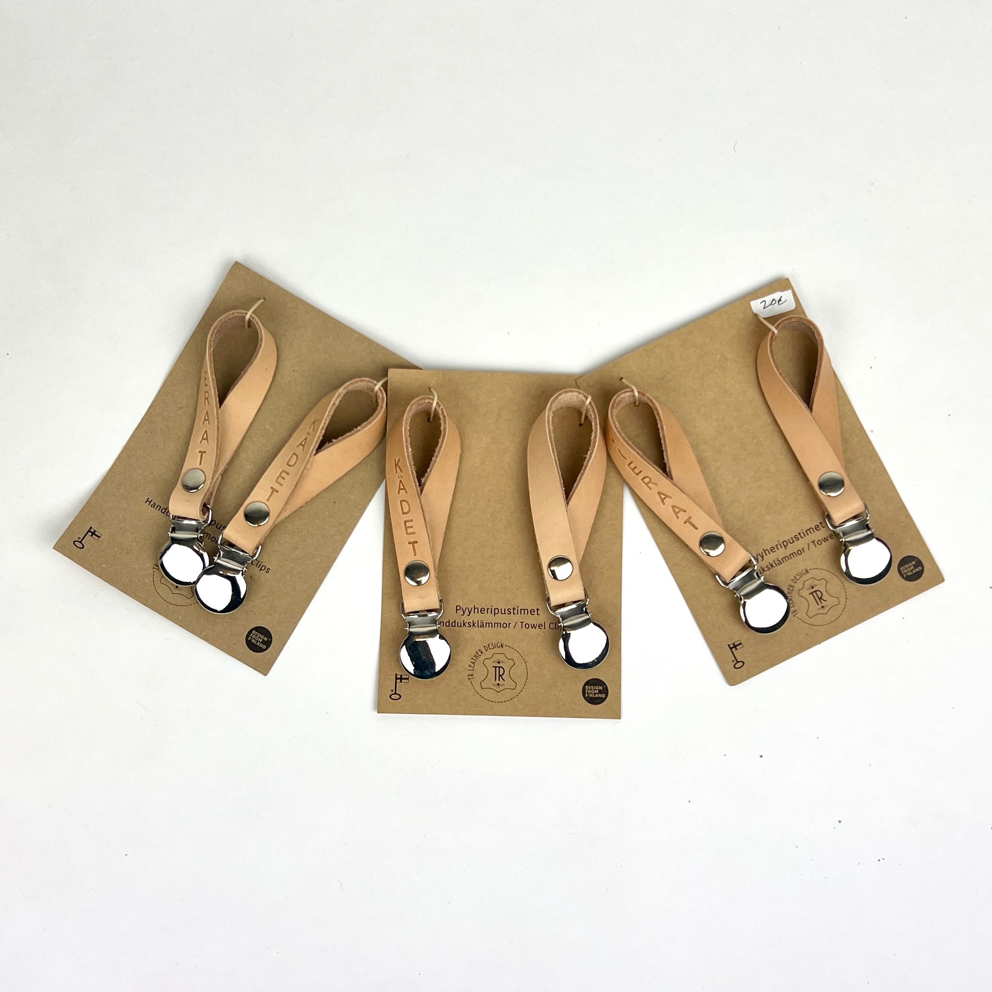 TR Leather Designin suomalaisesta nahasta valmistamat pyyheklipsit tuovat tyyliä niin kylpyhuoneeseen, vessaan kuin vaikka keittiöönkin. Pyyheklipsit ovat jämäkkää nahkaa ja laadukas metalliklipsi varmistaa, että pyyhkeet pysyvät siististi kiinni nipsussa.