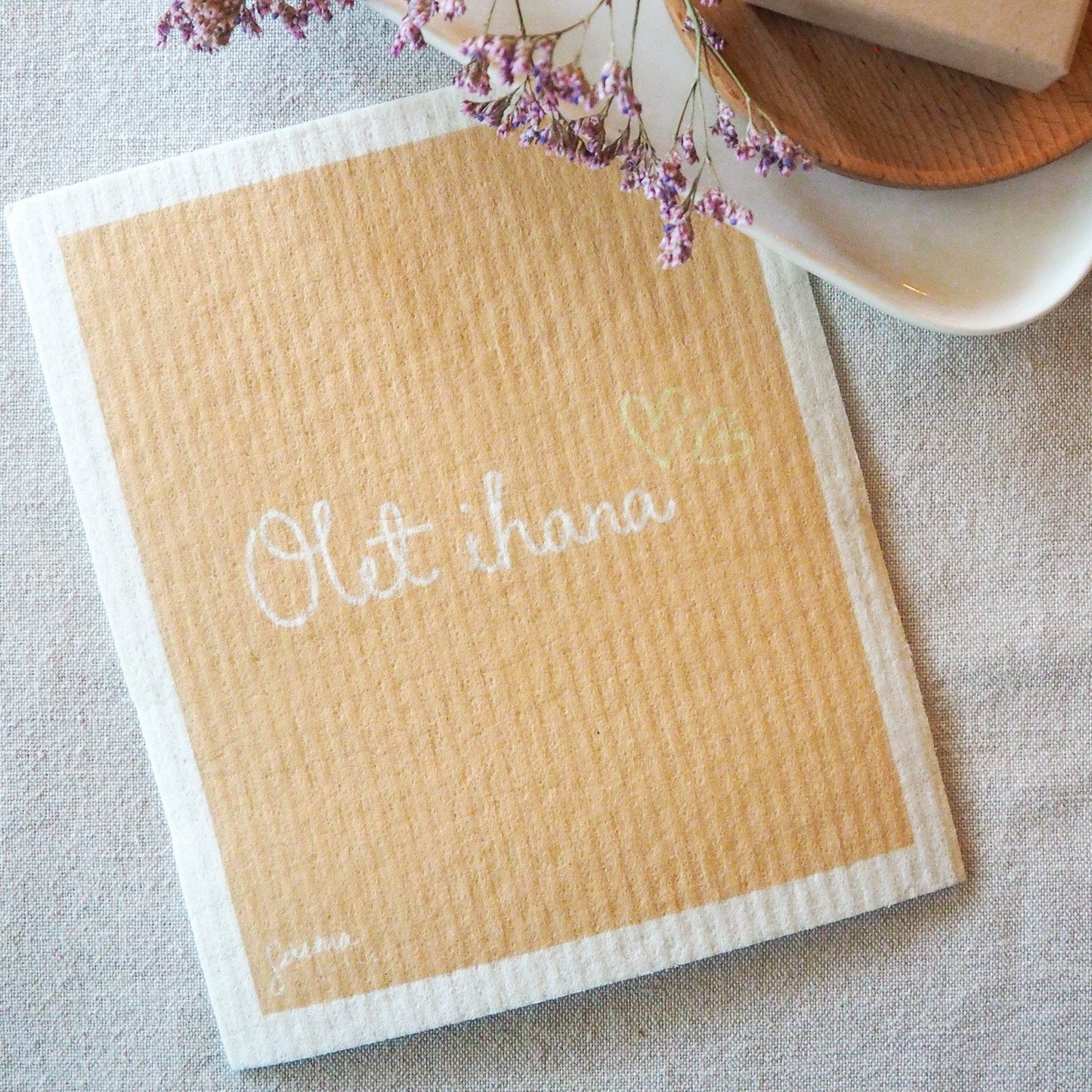 Saima Visualsin ympäristöystävällinen tiskirätti ihanalla Olet ihana -tekstillä.