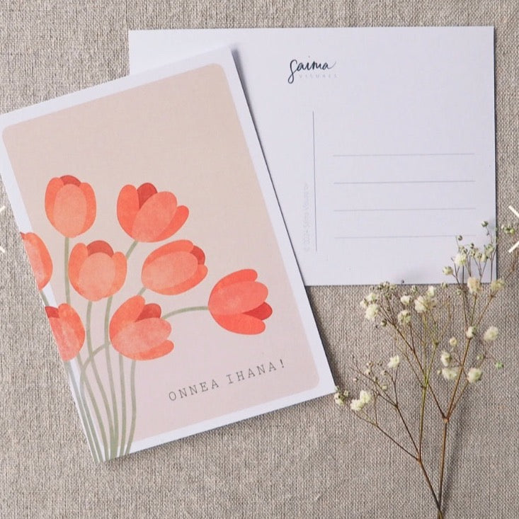 Saima Visualsin kauniit kukkateemainen kortti tekstillä ”Onnea ihana”. Onnittele kaikkia elämäsi ihania kukkasin.