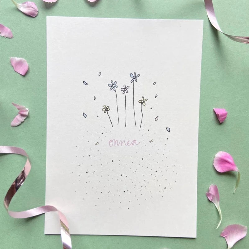 Puuhala Designin ihastuttava Onnea! -kortti välittää lämpimät onnittelut päivän sankarille.