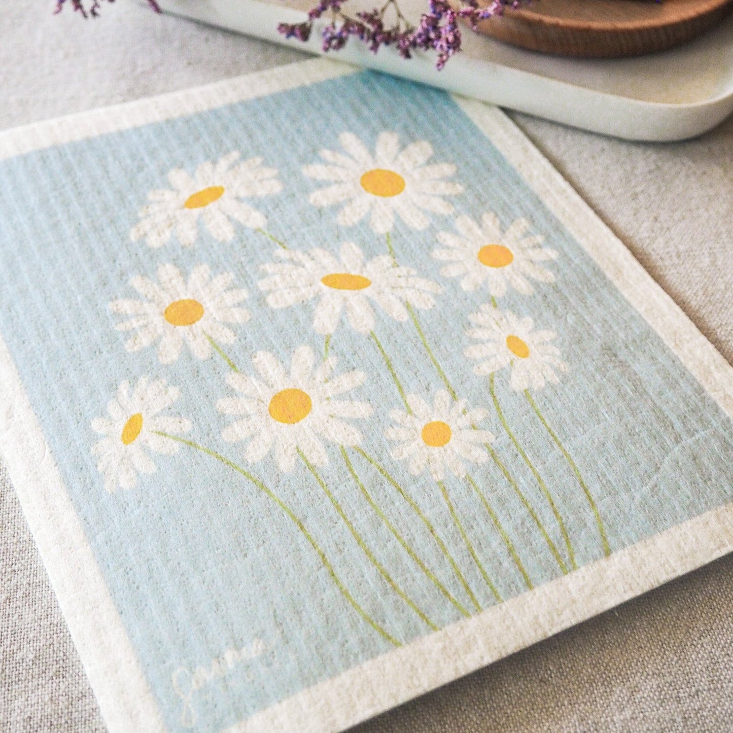 Saima Visualsin ympäristöystävällinen tiskirätti ihanalla Päivänkakkara-kuvituksella.