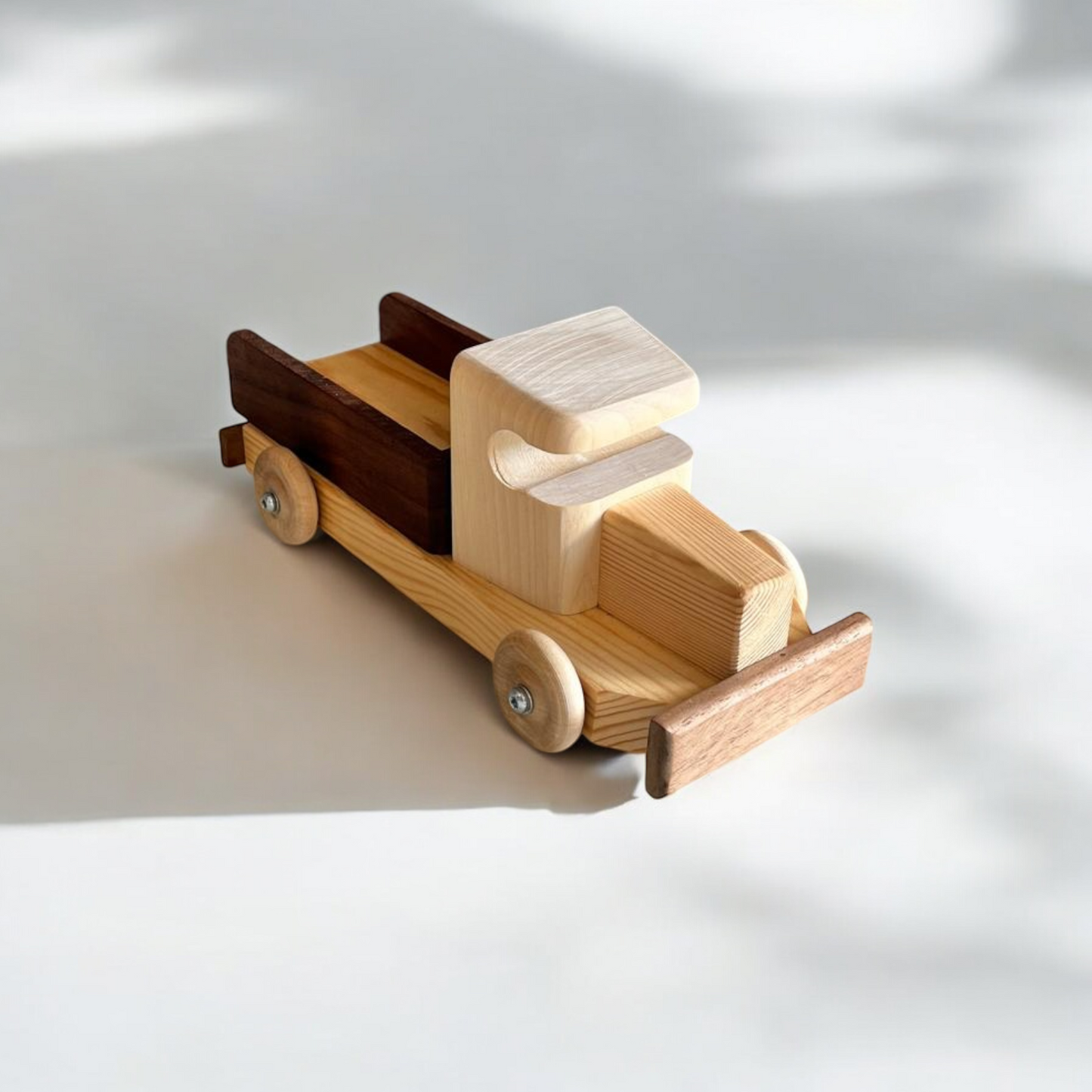 Tuffan puulelujen puinen Kuorma-auto. Vanhanajan kuorma-auto sopii hyvin lasten leikkeihin, mutta on myös kaunis koriste esimerkiksi kirjahyllyyn. Lelussa yhdistyvät kauniisti amerikkalainen pähkinäpuu ja suomalainen mänty.