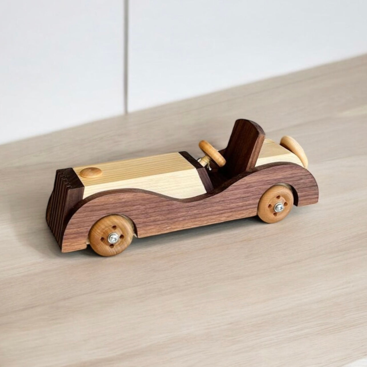 Tuffan puulelujen Urheiluauto on nostalginen näky takaa varmasti vauhdikkaat leikit. Urheiluauto sopii hyvin lasten leikkeihin, mutta on myös kaunis koriste esimerkiksi kirjahyllyyn. Lelussa yhdistyvät kauniisti amerikkalainen pähkinäpuu ja suomalainen mänty.