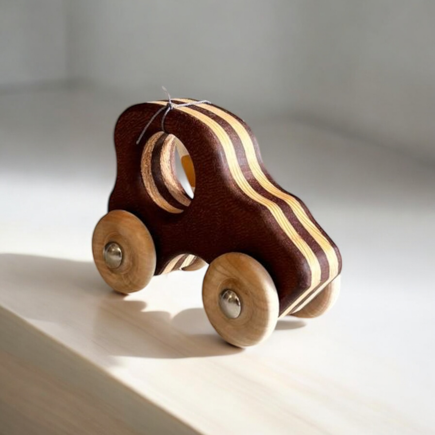 Tuffan puulelujen perinteinen Ring Bil -lelu perheen pienimmille. Pyöreän muotoilun ansiosta se sopii hyvin pieneen käteen ja on varmasti turvallinen lelu. Lelussa yhdistyvät kauniisti amerikkalainen pähkinäpuu ja suomalainen mänty.