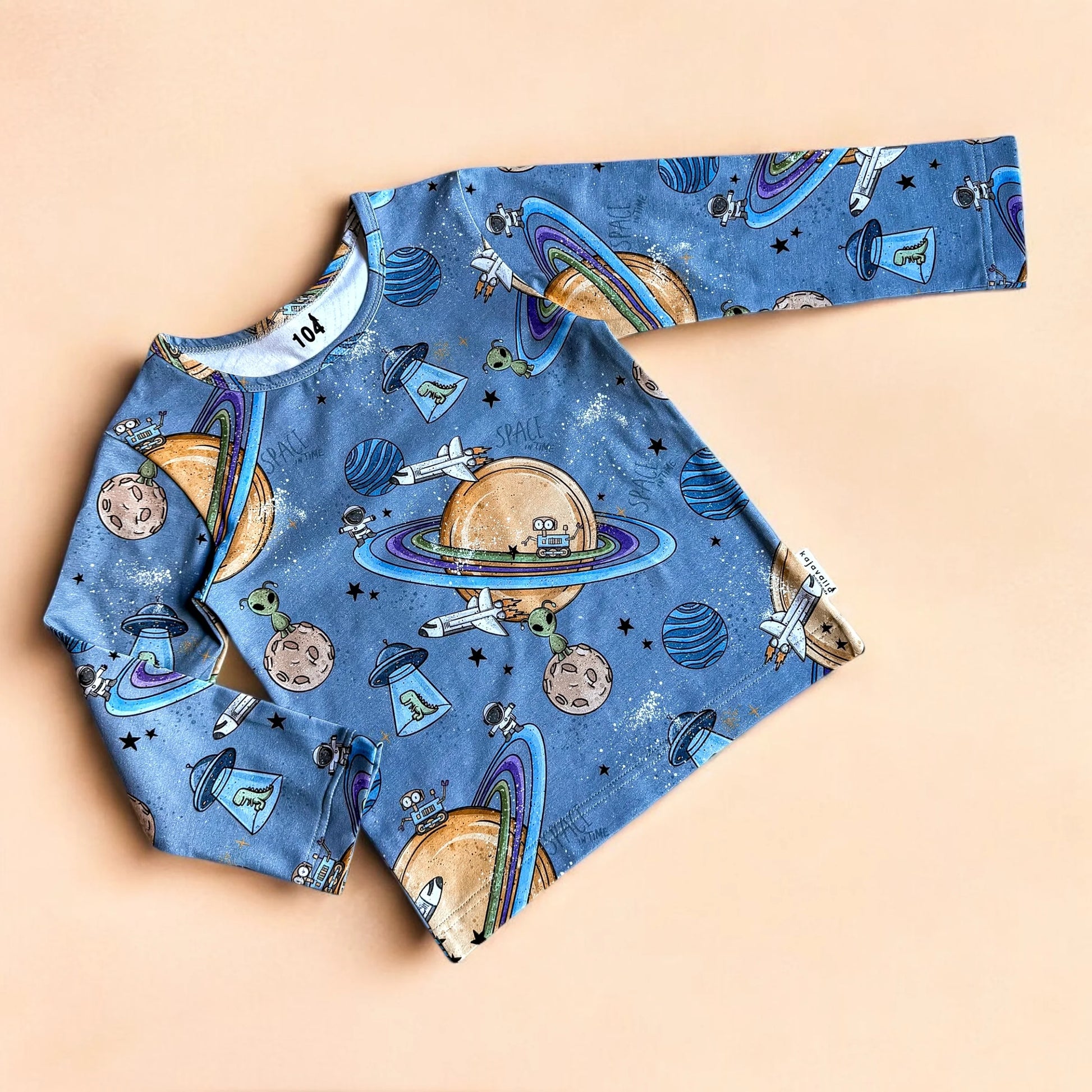 Kajavalla handmaden pehmeä ja joustava avaruusteemainen trikoopaita on täydellinen valinta lapsen jokaiseen päivään – leikkiin, kouluun ja kaikenlaisiin seikkailuihin. Tämä pitkähihainen paita on valmistettu korkealaatuisesta luomupuuvilla-elastaanitrikoosta, joka kestää toistuvaa pesua ja säilyttää muotonsa käytöstä toiseen.